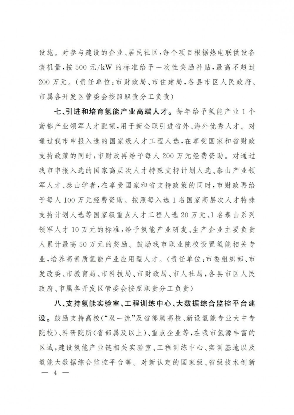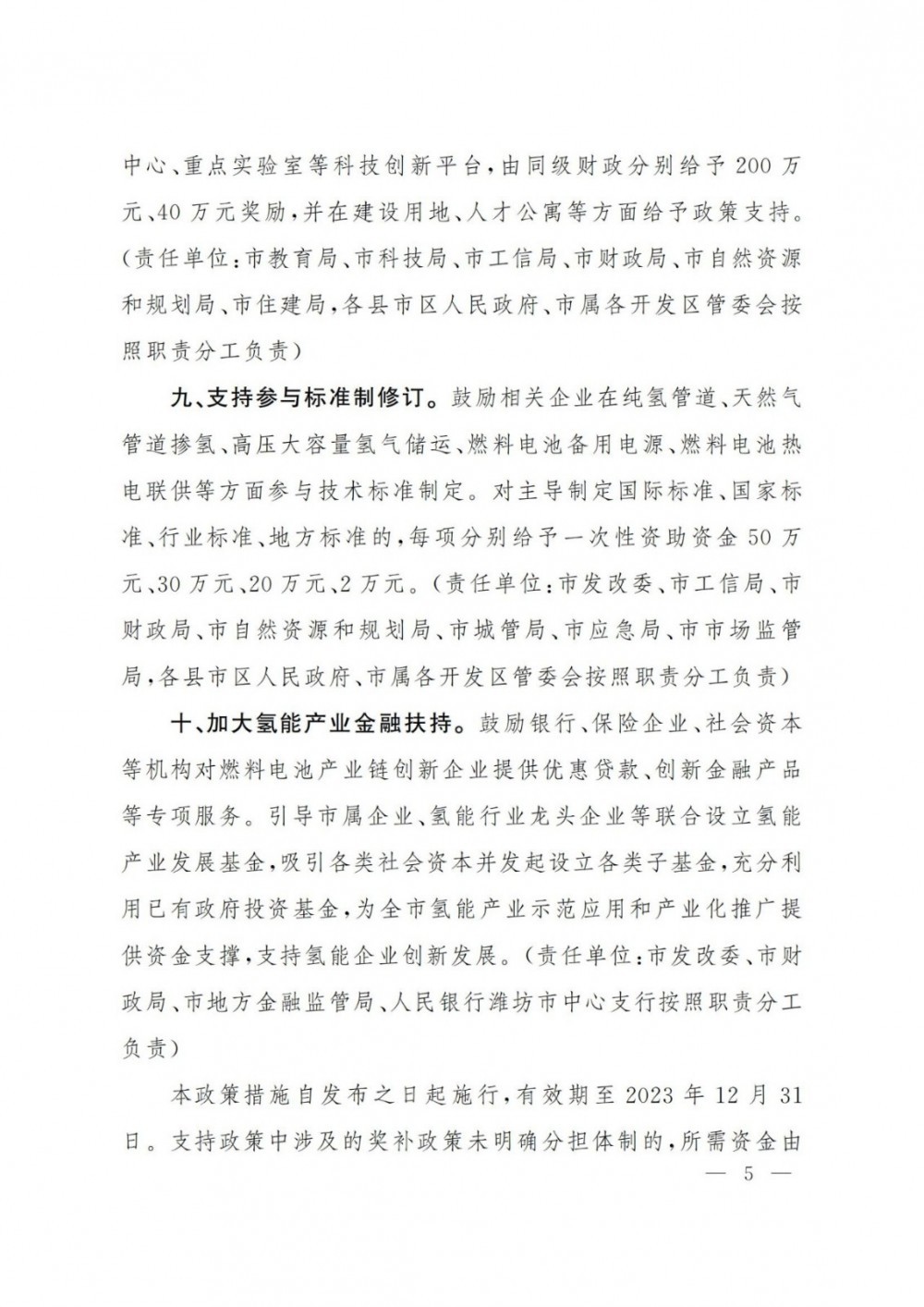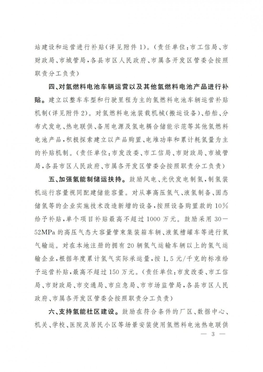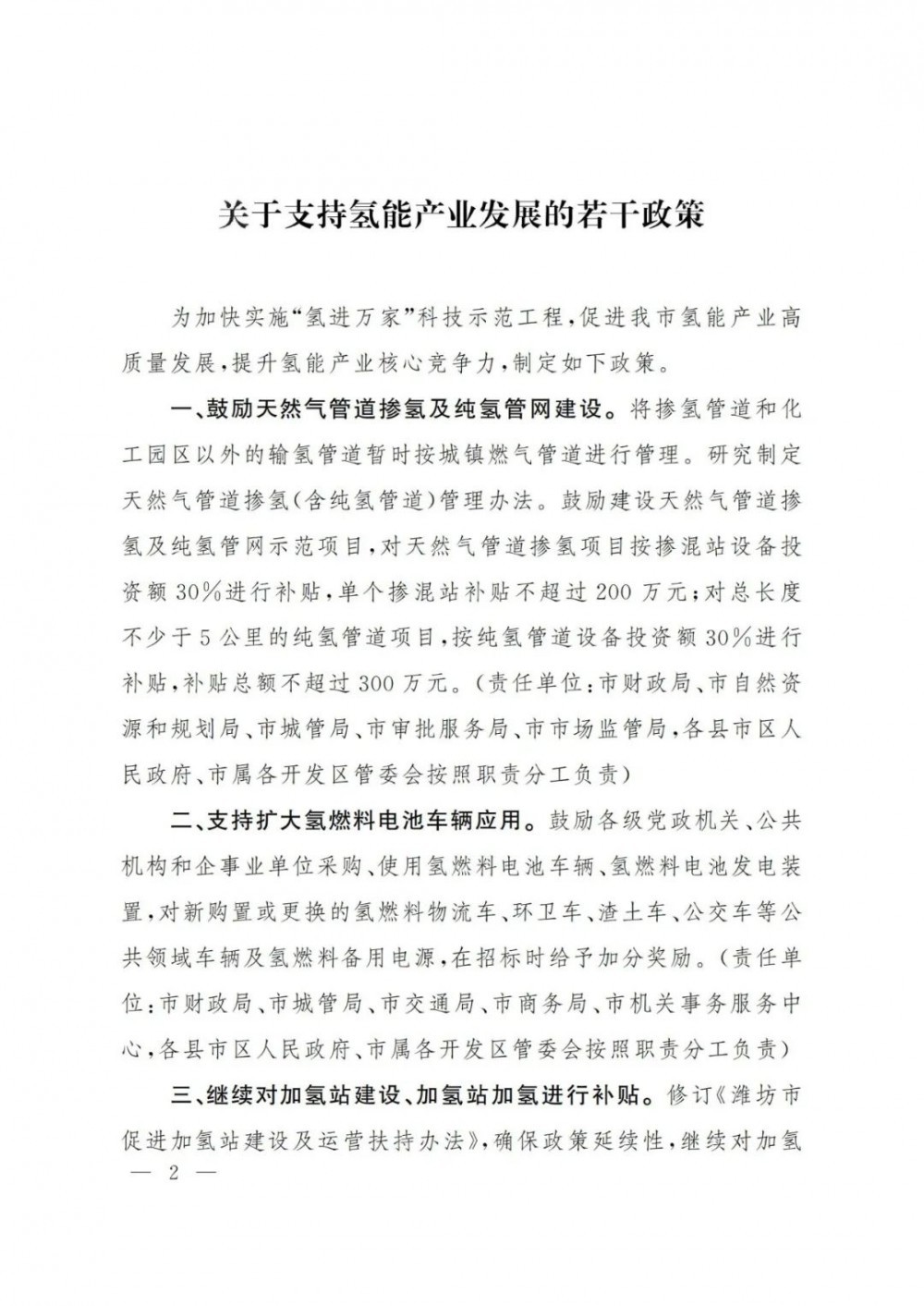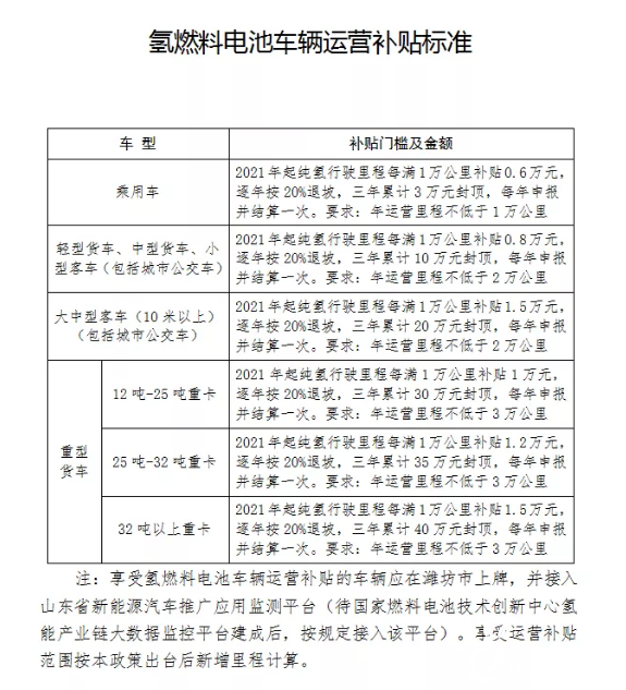 最高補貼1000萬!山東濰坊印發《關于支持氫能產業發展的若干政策》的通知!山東濰坊市政府印發(fa)了《關于支持氫能(neng)產業發(fa)展的若干政策》的通知,(以下簡稱“通知”)。通知全面對(dui)氫能(neng)產業做出部署。 在氫(qing)能儲運方面,通知要求:“鼓勵建設(she)(she)天(tian)然氣(qi)管(guan)(guan)道摻氫(qing)及(ji)純氫(qing)管(guan)(guan)網示范項目(mu),對天(tian)然氣(qi)管(guan)(guan)道摻氫(qing)項目(mu)按(an)摻混站(zhan)設(she)(she)備投資(zi)額(e)30%進行(xing)補(bu)貼(tie),單個(ge)摻混站(zhan)補(bu)貼(tie)不(bu)超過200萬元(yuan);對總長(chang)度(du)不(bu)少于5公里(li)的純氫(qing)管(guan)(guan)道項目(mu),按(an)純氫(qing)管(guan)(guan)道設(she)(she)備投資(zi)額(e)30%進行(xing)補(bu)貼(tie),補(bu)貼(tie)總額(e)不(bu)超過300萬元(yuan)。” 通知還提(ti)出:“對從(cong)事高壓氫(qing)(qing)(qing)氣(qi)、液氫(qing)(qing)(qing)制備(bei)、固態(tai) 儲氫(qing)(qing)(qing)等的企業實(shi)施技(ji)術改造(zao)新增的設備(bei),按照設備(bei)購置款的10% 給予補貼,單個(ge)項目補貼最高不超過1000萬元。鼓勵采用30- 52MPa的高壓氣(qi)態(tai)大容量管束集裝箱車輛(liang)、液氫(qing)(qing)(qing)槽罐車等進行氫(qing)(qing)(qing)氣(qi)輸運(yun)(yun)(yun)。對在本地注冊(ce)的擁有20輛(liang)氫(qing)(qing)(qing)氣(qi)運(yun)(yun)(yun)輸車輛(liang)以(yi)上的氫(qing)(qing)(qing)氣(qi)運(yun)(yun)(yun)輸企業,根據年度累計氫(qing)(qing)(qing)氣(qi)實(shi)際承運(yun)(yun)(yun)量,按1.5元/千克的標準給予運(yun)(yun)(yun)營補貼,最高不超過150萬元。” 在支持(chi)燃料電池車(che)方面(mian),通知明(ming)確給予支持(chi),提(ti)出:“對(dui)新購置或更換的氫燃料物流車(che)、環衛車(che)、渣土車(che)、公(gong)交車(che)等公(gong)共(gong)領域車(che)輛及氫燃料備用(yong)電源,在招標時給予加分獎勵。” 在加氫(qing)站補(bu)貼(tie)方面(mian),通知(zhi)提出:“加氫(qing)站2022年之前(qian)(qian)建成(cheng)的(de),日加氫(qing)能(neng)力(li)超(chao)過(guo)1000公(gong)斤的(de),最高將給予(yu)350萬(wan)的(de)補(bu)貼(tie),2023年之前(qian)(qian)建成(cheng)的(de),日加氫(qing)能(neng)力(li)超(chao)過(guo)1000公(gong)斤的(de),給予(yu)300萬(wan)補(bu)貼(tie)。” 原文如下: