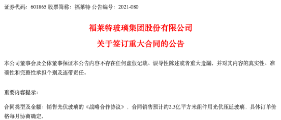 福萊特簽46億光伏大單;4.8元/瓦,中南院中標廣東百兆瓦漁光互補EPC項目;國家能源集團1.1GW光伏逆變器招標| 一周綜述導讀 晶科能源與合肥市委達成戰略合作意向;上海電氣新董事長冷偉青上任;華能與陜西丹鳳縣簽約335MW整縣屋頂分布式及農光互補項目;又一家名企完成更名,全力進軍光伏;新增光伏1.5GW!浙江衢州市能源發展“十四五”規劃出臺;晶科能源與國軒高科簽署戰略合作協議;福萊特簽46億光伏大單;國家能源集團1.1GW光伏逆變器招標…… 行業動態 01 晶科能源與合肥市委達成戰略合作意向 7月28日,晶科能源創始人兼CEO陳康平與安徽省委常委、合肥市委書記虞愛華就光伏項目合作展開洽談,副市長路軍陪同參會。 雙方商定,秉持“說干就干、干就干好”的原則,加快推動晶科有關項目簽約落地肥東縣,并合作探索設立研發中心等后續項目,同時推進合肥市輻射周邊縣級市光伏整縣推進工作的開展落地,助力合肥光伏產業延鏈、補鏈、強鏈! 02 上海電氣新董事長冷偉青上任 此外,董事會同意免去鄭建華上海電氣集團股份有限公司董事長、戰略委員會主席及委員、首席執行官職務。同意提名冷偉青為公司第五屆董事會董事候選人,任期自股東大會審議通過之日起至第五屆董事會任期屆滿之日止。同意冷偉青正式任職公司董事后擔任公司第五屆董事會董事長。 03 華能與陜西丹鳳縣簽約335MW整縣屋頂分布式及農光互補項目 7月27日,陜西省丹鳳縣人民政府與華能新能源股份有限公司陜西分公司在丹鳳舉行農光互補及分布式光伏發電項目簽約儀式,這標志華能集團新能源公司農光互補及分布式光伏發電項目正式落戶丹鳳。丹鳳縣縣長徐秀全與華能新能源陜西分公司黨委副書記、總經理丁為成功簽訂了總投資約15億元的農光互補及分布式光伏發電項目投資合作框架協議書。 04 又一家名企完成更名,全力進軍光伏! 7月28日,寶峰時尚發布更改公司名稱公告。公告稱,寶峰時尚國際控股有限公司的公司名稱已更改為金陽新能源科技控股有限公司。因此,從2021年8月2日起,其普通股(證券代號:1121)的證券簡稱也將更改為“金陽新能源”。 7月26日,寶峰時尚發布公告稱,公司的間接全資子公司金陽徐州已分別與太一光伏及熊貓光伏簽訂硅片銷售協議。協議顯示,自2021年8月開始的12個月期限內, 金陽徐州將分別向太一光伏及熊貓光伏各自供應總量不少于一億片的單鑄硅片。每月的出貨量以及對應的硅片單價將由出貨當月前一個月月中的市場情況及金陽徐州的產能狀況決定。這是寶峰時尚拿下的第二長單,共簽署了4億片硅片供貨合同,并將于8月開始批量出貨,正式成功進入硅片商業化生產階段。 05 新增光伏1.5GW!浙江衢州市能源發展“十四五”規劃出臺! 7月28日,衢州市人民政府辦公室關于印發衢州市能源發展“十四五”規劃的通知,通知指出,全力推進可再生能源發展,將可再生能源融入城市能源供應體系。深挖集中式光伏潛力,鼓勵整縣分布式光伏試點,探索光伏建筑一體化、光伏交通一體化等創新應用,“十四五”新增光伏裝機150萬千瓦。 06 晶科能源與國軒高科簽署戰略合作協議 近日,晶科能源股份有限公司(以下簡稱晶科能源)與國軒高科股份有限公司(以下簡稱“國軒高科”) 簽署戰略合作協議,雙方將攜手開拓全球光伏儲能市場,聚焦光伏、儲能領域,為客戶提供一站式、綜合性解決方案,從而更主動積極服務以新能源為主體的新型電力系統的建設。