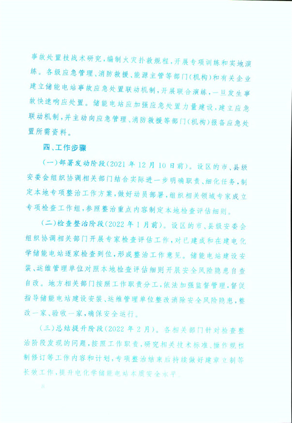 日前,國務院安委會辦公室關于印發《電化學儲能電站安全風險隱患專項整治工作方案》。通知中提出2021年12月10日前,制定本地專項整治工作方案,做好動員部署,成立專項檢查工作組;2022年1月前,對已建成和在建電化學儲能電站逐家檢查到位,指導儲能電站建設安裝;2022年2月,專項整治結束后持續做好建章主制等長效工作,提升電化學儲能電站本質安全水平。