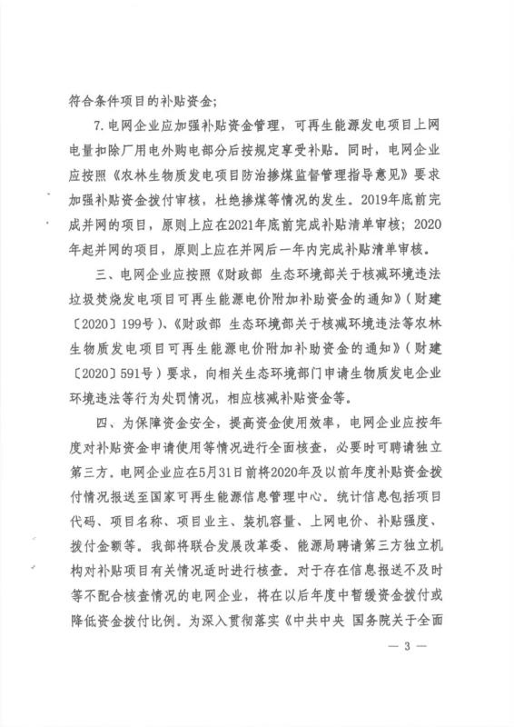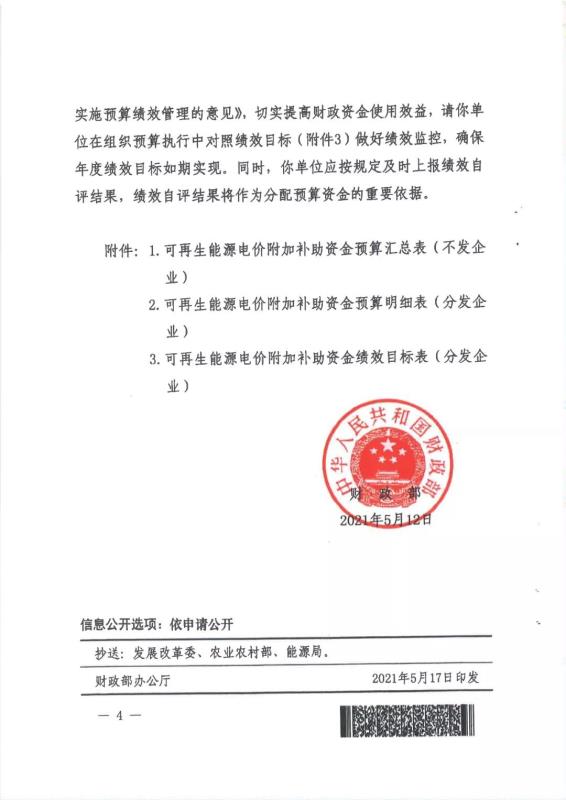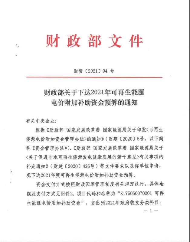 國家電網有限公司關于2021年可再生(sheng)能源電價附加補助資金撥付情況的(de)公告(gao) 按照《財政部 國家(jia)發展改革(ge)委 國家(jia)能(neng)源(yuan)(yuan)局關于印(yin)發<可(ke)再生(sheng)(sheng)能(neng)源(yuan)(yuan)電(dian)價附加(jia)(jia)資(zi)金(jin)管理辦法>的通知》(財建〔2020〕5號(hao))文件要(yao)求,國家(jia)電(dian)網(wang)有限公司(以下簡稱“公司”)將(jiang)可(ke)再生(sheng)(sheng)能(neng)源(yuan)(yuan)電(dian)價附加(jia)(jia)中央補助資(zi)金(jin)的撥(bo)付原則和順序(xu)等相關情況公告如下: 一、補助資金撥付(fu)原則(ze)和順序(xu) 公(gong)司嚴格按照《財(cai)政(zheng)部關于(yu)下達2021年可再生能源電價附加(jia)補(bu)助資(zi)金預算的(de)通知》(財(cai)資(zi)〔2021〕94號)中明確(que)的(de)補(bu)貼(tie)資(zi)金撥付(fu)原則(ze)和(he)順序,在收到財(cai)政(zheng)部撥付(fu)款(kuan)項(xiang)后,對納入(ru)補(bu)貼(tie)目錄或(huo)清單且(qie)滿足結算條(tiao)件的(de)各(ge)類(lei)項(xiang)目進行(xing)及時、足額轉付(fu)。具體原則(ze)以各(ge)省電力公(gong)司公(gong)告(gao)為準。 二、2021年補助資金總體情(qing)況 2021年,財(cai)政部共下達公司可(ke)再生能源電價附(fu)加補助(zhu)資金年度預(yu)算7,610,073萬元(yuan),其(qi)中:風力發電2,634,613萬元(yuan)、太(tai)陽能發電4,527,188萬元(yuan)、生物質能發電448,272萬元(yuan)。 附件:《財政部關于下達2021年可(ke)再生能源電價(jia)附加補助資金預算的通知》(財資〔2021〕94號) 國家電(dian)網有限(xian)公司 2021年12月31日(ri)