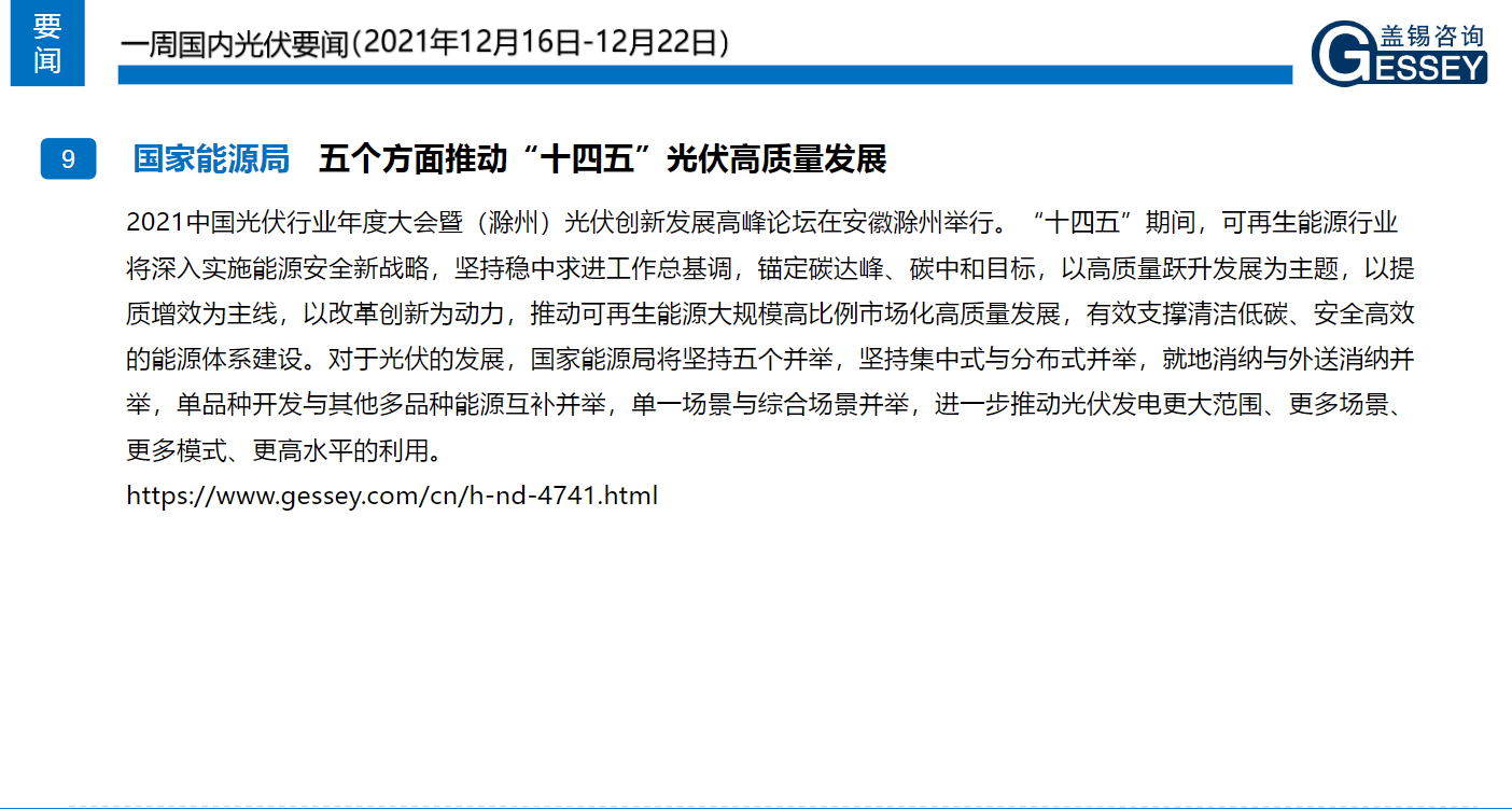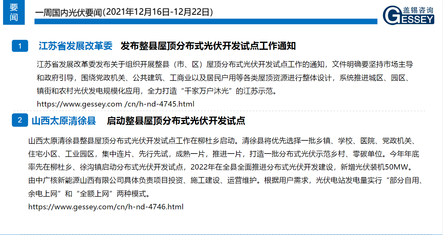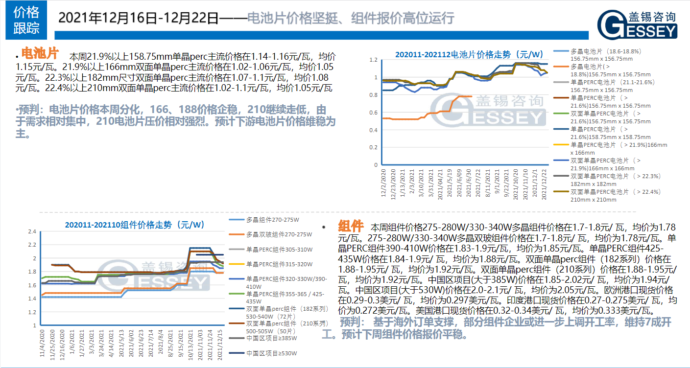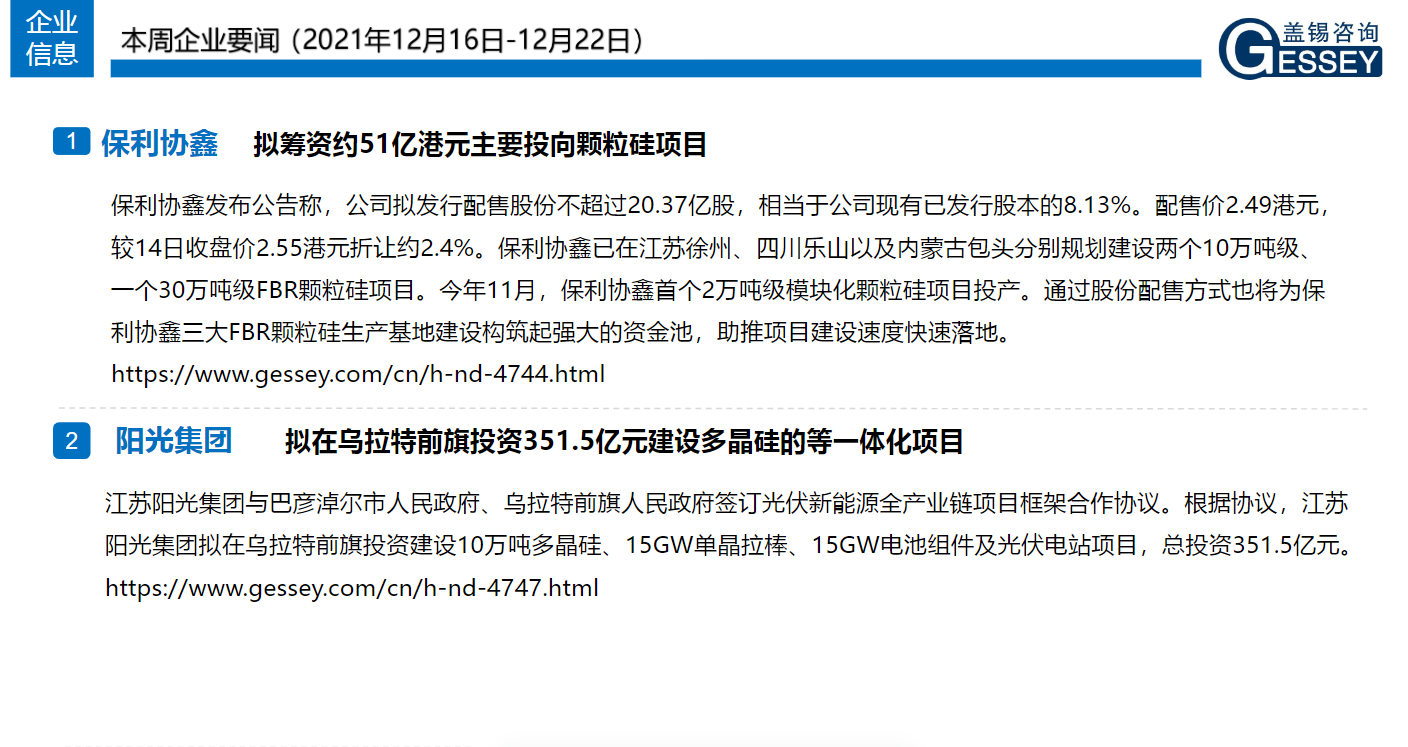 一周光伏市場洞察(2021年12月16日-12月22日)1、 信(xin)義(yi)光能(neng) 投建20萬(wan)噸多晶硅(gui)!成立(li)子公司進軍硅(gui)料,位于于中國云(yun)南省曲靖市(shi)麒麟區建設多晶硅(gui)生產(chan)廠房(fang),估計年產(chan)能(neng)為6萬(wan)噸,預計2021年2月后開建; 2、 陽光集團 擬在烏拉特前旗投資351.5億元建設10萬噸多晶硅、15GW單晶拉棒、15GW電池組件及光伏電站項目; 3、 晶(jing)澳(ao)科(ke)技 曲靖基地20GW單(dan)晶(jing)硅(gui)(gui)棒、20GW單(dan)晶(jing)硅(gui)(gui)片項目(mu)投產(chan); 4、東方日升其高效異質結系列組件最高功率達到721.016W,組件效率高達23.65% ; 市場方方面:下(xia)游硅料(liao)繼續窄幅(fu)松(song)動,硅片需(xu)求有支(zhi)撐價(jia)格維穩(wen)(wen),電池片組件(jian)價(jia)格企穩(wen)(wen)。
