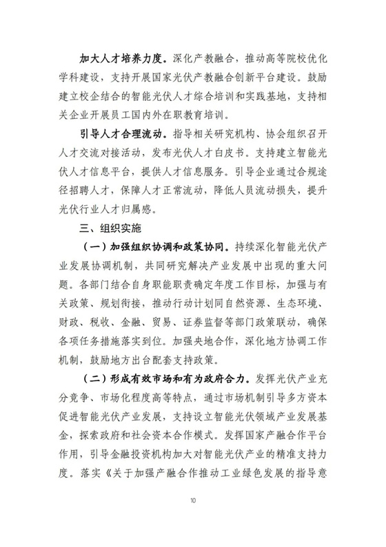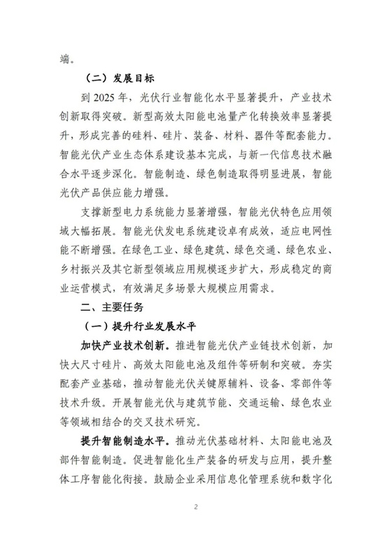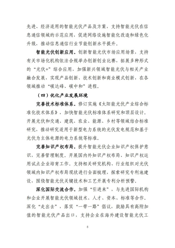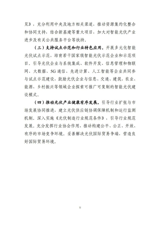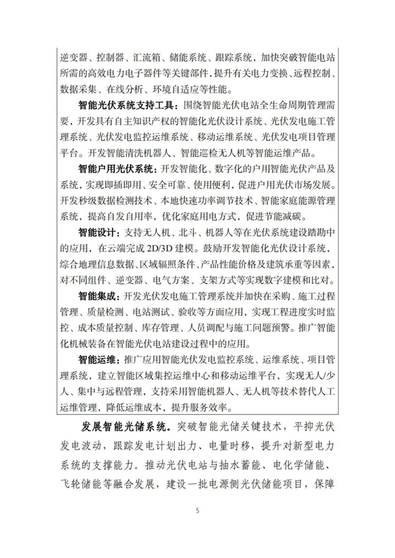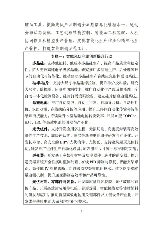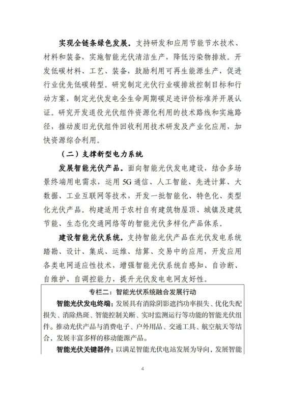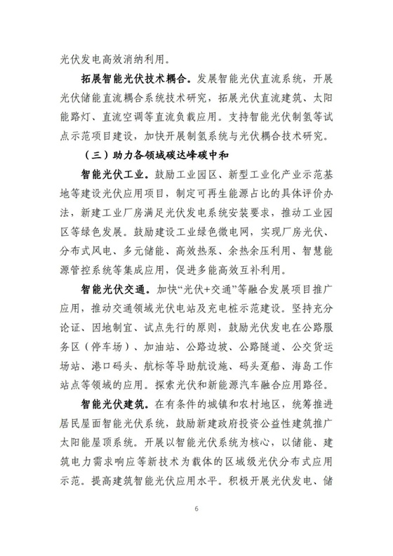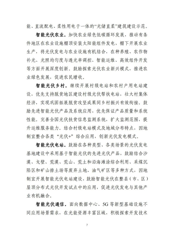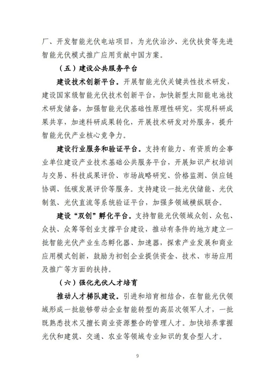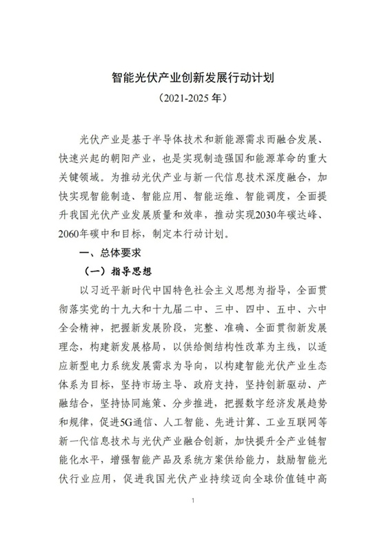 1月4日,工(gong)業(ye)和信息化部、住(zhu)房和城鄉建設部、交通運輸部、農業(ye)農村部、國家(jia)能(neng)源局聯(lian)合發布了(le)《智能(neng)光(guang)伏產業(ye)創新發展(zhan)行動計劃(hua)》。 要求到2025年,光伏行業智能化水平顯(xian)著(zhu)提(ti)升(sheng)(sheng),產(chan)業技術創新取得(de)突破。新型高效太陽能電池量產(chan)化轉(zhuan)換效率顯(xian)著(zhu)提(ti)升(sheng)(sheng),形成完(wan)善的硅(gui)料、硅(gui)片、裝備、材料、器件等配套能力。 智(zhi)能光伏產業生(sheng)態(tai)體(ti)系建設基本完成,與新一代(dai)信息技術融合水平逐(zhu)步深(shen)化。智(zhi)能制造(zao)、綠色(se)制造(zao)取(qu)得(de)明(ming)顯(xian)進展(zhan),智(zhi)能光伏產品(pin)供應能力增(zeng)強。 支撐(cheng)新型電(dian)力系(xi)統(tong)能(neng)力顯著增強,智能(neng)光(guang)伏特(te)色應(ying)用領域大(da)幅(fu)拓(tuo)展。智能(neng)光(guang)伏發電(dian)系(xi)統(tong)建設卓有成效,適應(ying)電(dian)網性(xing)能(neng)不(bu)斷增強。 在(zai)綠(lv)色工業(ye)、綠(lv)色建筑、綠(lv)色交通、綠(lv)色農業(ye)、鄉村振(zhen)興及其它新型(xing)領域(yu)應(ying)(ying)用(yong)規模(mo)逐步(bu)擴大,形成穩定的商業(ye)運(yun)營(ying)模(mo)式,有效滿足多場景大規模(mo)應(ying)(ying)用(yong)需求。 計劃還強調,要繼續開(kai)展(zhan)村(cun)級電(dian)站和農村(cun)戶用電(dian)站建設(she),優先支(zhi)持(chi)脫貧地區建設(she)村(cun)級光(guang)伏幫扶電(dian)站,壯大村(cun)集(ji)體(ti)經濟(ji),實(shi)現鞏(gong)固拓展(zhan)脫貧攻堅成果同(tong)鄉(xiang)村(cun)振興有(you)效銜接。 全文(wen)如下: 工業和信息(xi)化部 住(zhu)房和城鄉建(jian)設部 交通運輸部 農業農村部 國家能(neng)源局關于印發《智能(neng)光伏(fu)產業創新發展行動計劃(2021-2025年)》的通知 工信部聯電(dian)子(zi)〔2021〕226號 各省、自治區、直(zhi)轄(xia)市(shi)及(ji)計(ji)劃單列市(shi)、新疆生產建設兵團工業和信(xin)息(xi)化(hua)、住房(fang)和城鄉建設、交通(tong)運輸、農業農村(cun)、能源主管部門: 現(xian)將(jiang)《智能(neng)光伏產(chan)業創新發展行動計劃(2021-2025年)》印發給你們,請結(jie)合實(shi)際(ji)認真貫徹(che)落(luo)實(shi)。 附件:智(zhi)能光伏產業創(chuang)新發展行動計(ji)劃(2021-2025年) 工業(ye)和信息化(hua)部 住房(fang)和城(cheng)鄉建設部(bu) 交通運輸部 農(nong)業農(nong)村部 國家能源局 2021年12月31日