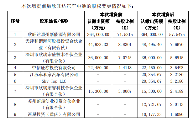 2月24日,欣旺達發布(bu)公(gong)(gong)告(gao),欣旺達電子(zi)股(gu)份有(you)限公(gong)(gong)司(si)于2022年2月23日召開第(di)五屆董事會(hui)(hui)第(di)二十(shi)六(liu)次會(hui)(hui)議(yi)、第(di)五屆監事會(hui)(hui)第(di)二十(shi)六(liu)次會(hui)(hui)議(yi),審議(yi)通(tong)過(guo)了《關于欣旺達電動(dong)汽(qi)(qi)車電池(chi)有(you)限公(gong)(gong)司(si)增資(zi)(zi)(zi)的議(yi)案》。本(ben)(ben)次增資(zi)(zi)(zi)方式:和諧海河、車和家(jia)、Sky Top、蔚瑞投(tou)(tou)資(zi)(zi)(zi)、巡星投(tou)(tou)資(zi)(zi)(zi)、睿(rui)海裕(yu)能、嘉興頎(qi)辰、恒雋瑞、上汽(qi)(qi)金石(shi)、華友控股(gu)、奧聞(wen)投(tou)(tou)資(zi)(zi)(zi)、廣祺(qi)欣電、合盛投(tou)(tou)資(zi)(zi)(zi)、鑫旺綠色、信之風投(tou)(tou)資(zi)(zi)(zi)、交銀(yin)轅憬、佛(fo)山誠煜、紅土岳(yue)川(chuan)、深創投(tou)(tou)共 19 家(jia) 企(qi)業以貨幣出資(zi)(zi)(zi)形(xing)式對欣旺達汽(qi)(qi)車電池(chi)進行增資(zi)(zi)(zi)。各本(ben)(ben)輪投(tou)(tou)資(zi)(zi)(zi)方同意按(an)照本(ben)(ben)協議(yi)約定的條款和條件以合計人(ren)民幣 243,000.00萬元(yuan)(yuan)(或等值(zhi)美元(yuan)(yuan),“增資(zi)(zi)(zi)款”)向公(gong)(gong)司(si)增資(zi)(zi)(zi),認購(gou)公(gong)(gong)司(si)合計人(ren)民幣123,654.60萬元(yuan)(yuan)的新(xin)增注冊資(zi)(zi)(zi)本(ben)(ben),對應(ying)本(ben)(ben)次交易(yi)完成后公(gong)(gong)司(si)合計19.5495%的股(gu)權(quan)。 本(ben)次增資(zi)(zi)完(wan)成后(hou),欣(xin)旺(wang)達(da)汽車電(dian)池的(de)注冊(ce)資(zi)(zi)本(ben)將由 508,866.66 萬元人民幣(bi)增至 632,521.26 萬元人民幣(bi)。本(ben)次增資(zi)(zi)完(wan)成后(hou),公司下屬子公司欣(xin)旺(wang)達(da)惠州(zhou)新能(neng)源有(you)限公司持(chi)有(you)欣(xin)旺(wang)達(da)汽車電(dian)池的(de)股權比(bi)例由71.5315%變更為57.5475%,欣(xin)旺(wang)達(da)汽車電(dian)池仍屬于公司合并報表范圍內(nei)的(de)控股子公司。 據了(le)解19家(jia)投資方中,江蘇車和家(jia)是(shi)理(li)想汽車關(guan)聯公司(si),Sky Top LLC是(shi)小鵬汽車關(guan)聯公司(si),蘇州蔚瑞創(chuang)投是(shi)蔚(yu)來汽車(che)關聯(lian)(lian)公司(si),上(shang)(shang)汽金石是(shi)上(shang)(shang)汽關聯(lian)(lian)公司(si),廣祺欣電(dian)為廣汽關聯(lian)(lian)公司(si),信之風、東風交銀為東風關聯(lian)(lian)公司(si)。這意味著,三家頭部造車(che)新勢力將共同“扶持”欣旺(wang)達的動力電池業務。 “本次交易(yi)有利(li)于欣(xin)旺達汽車(che)電(dian)(dian)池(chi)獲得進(jin)一(yi)步(bu)發(fa)展的經營資金,優化財務(wu)結構,減輕債務(wu)負擔,增強(qiang)欣(xin)旺達汽車(che)電(dian)(dian)池(chi)抗風險(xian)能(neng)力,有利(li)于滿足公(gong)司汽車(che)動力電(dian)(dian)池(chi)業務(wu)戰略發(fa)展需求(qiu)。”欣(xin)旺達表(biao)示(shi),交易(yi)將促進(jin)動力電(dian)(dian)池(chi)業務(wu)良性(xing)運營和可持續發(fa)展,符合公(gong)司投資規(gui)劃及(ji)長遠利(li)益(yi)。