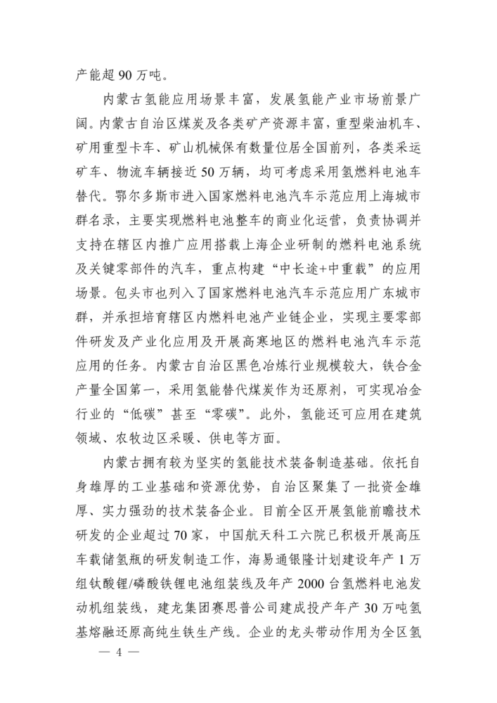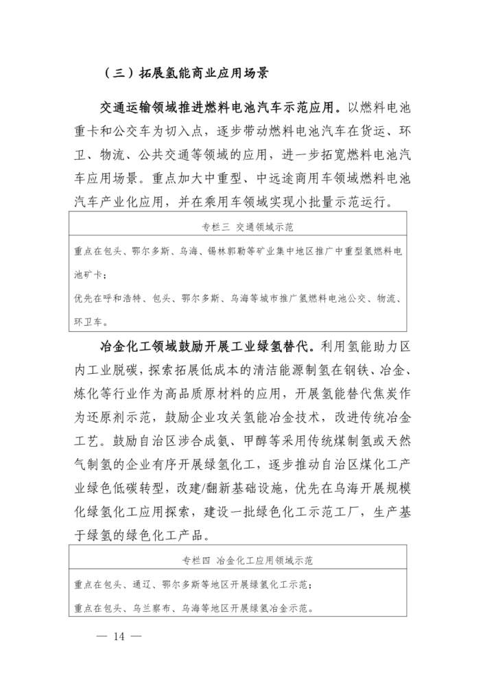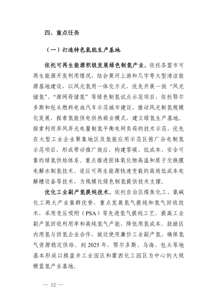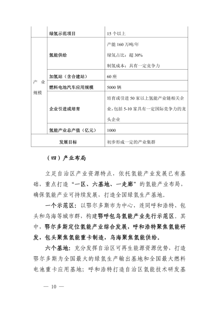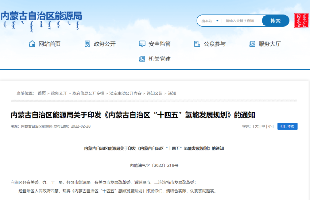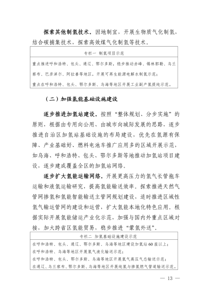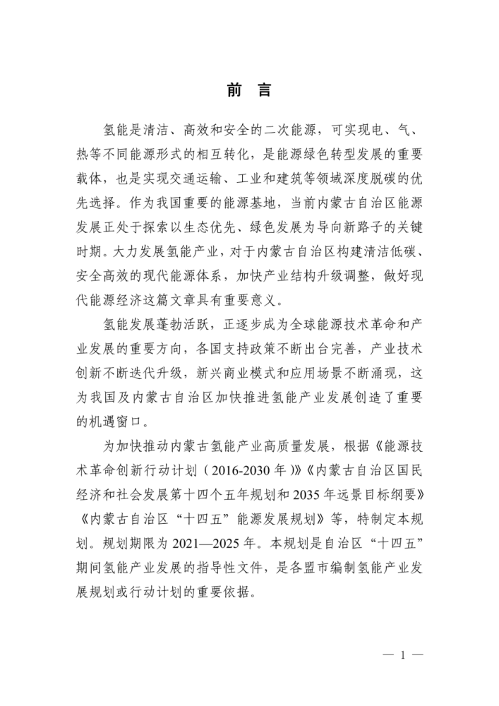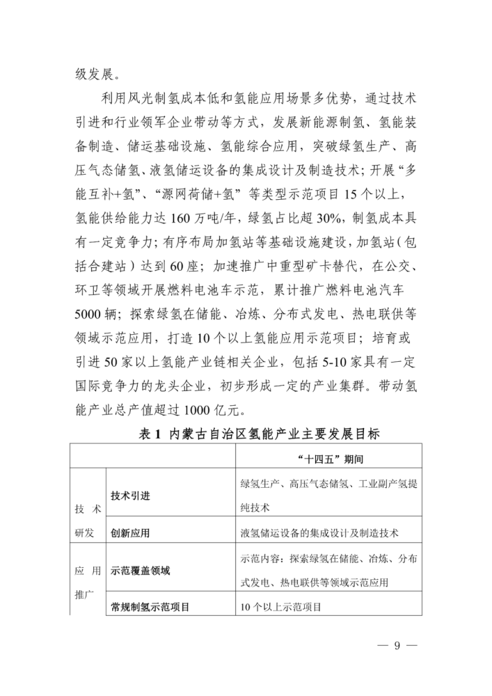 制氫160萬噸/年,總產值超1000億!內蒙古氫能“十四五”規劃來了!2月28日,內蒙(meng)(meng)古能(neng)源局發(fa)布關于(yu)印發(fa)《內蒙(meng)(meng)古自治區“十四五”氫能(neng)發(fa)展(zhan)規(gui)劃》(以下簡稱《發(fa)展(zhan)規(gui)劃》)的通知。 《發展規劃》指出(chu)—— 利用(yong)風光(guang)制氫成(cheng)本低和氫能應用(yong)場景多優勢,通過技術(shu)引進和行業領(ling)軍企業帶動等(deng)方(fang)式,發展新能源制氫、氫能裝備(bei)制造(zao)、儲(chu)運基礎設(she)施、氫能綜合應用(yong),突破綠氫生(sheng)產、高(gao)壓氣態儲(chu)氫、液氫儲(chu)運設(she)備(bei)的集成(cheng)設(she)計及(ji)制造(zao)技術(shu);開展“多能互補+氫”、“源網荷儲(chu)+氫”等(deng)類(lei)型(xing)示范項目15個以(yi)上,氫能供給能力(li)達160萬噸/年(nian),綠氫(qing)(qing)占(zhan)比超(chao)30%,制氫(qing)(qing)成本具(ju)有一定競爭力;有序(xu)布局加氫(qing)(qing)站等基(ji)礎設施建(jian)設,加氫(qing)(qing)站(包括合建(jian)站)達到60座;加速(su)推廣(guang)中重型礦卡替代,在公交、環衛等領域開展(zhan)燃料(liao)電池(chi)車示范(fan),累計推廣燃料電池汽車5000輛;探(tan)索綠氫在(zai)儲能、冶煉(lian)、分布式發電、熱電聯供等(deng)領域(yu)示范應用(yong),打造10個以(yi)上(shang)氫能應用(yong)示范項(xiang)目;培育或引(yin)進(jin)50家(jia)以(yi)上(shang)氫能產業鏈相關企業,包(bao)括5-10家(jia)具(ju)有(you)一(yi)定國(guo)際競爭(zheng)力的龍頭企業,初步形成一(yi)定的產業集群。帶(dai)動氫能產業(ye)總產值超過1000億元。 《發展規劃》提出,重(zhong)點打造(zao)“一區、六基(ji)地、一走廊”的氫(qing)能產(chan)(chan)業布局(ju),確保氫(qing)能產(chan)(chan)業可(ke)持續發展,打造(zao)全國綠氫(qing)生產(chan)(chan)基(ji)地。 一個示范區:以鄂爾多斯市為中心,連同呼(hu)和浩特、包頭和烏海等城(cheng)市群,構建鄂呼(hu)包烏氫(qing)能(neng)產業先行示范(fan)區。其中,鄂爾多斯(si)定位(wei)氫(qing)能(neng)產業綜(zong)合發展,呼和浩(hao)特聚焦(jiao)氫(qing)能(neng)研發,包(bao)頭(tou)聚焦(jiao)氫(qing)能(neng)重(zhong)卡制造,烏海聚焦(jiao)氫(qing)能(neng)供給。 六個基地:充分發揮自治區可再生能源(yuan)資(zi)源(yuan)優勢,打(da)(da)(da)造(zao)(zao)(zao)(zao)鄂爾多斯(si)為全(quan)國(guo)最大的綠(lv)氫(qing)生(sheng)產(chan)輸出基(ji)(ji)地(di)(di)(di)(di)和全(quan)國(guo)最大燃料電池重(zhong)卡應用基(ji)(ji)地(di)(di)(di)(di);呼(hu)和浩特(te)打(da)(da)(da)造(zao)(zao)(zao)(zao)自治區(qu)氫(qing)能(neng)技術(shu)研(yan)發(fa)基(ji)(ji)地(di)(di)(di)(di);包頭打(da)(da)(da)造(zao)(zao)(zao)(zao)自治區(qu)燃料電池重(zhong)卡生(sheng)產(chan)基(ji)(ji)地(di)(di)(di)(di);烏海打(da)(da)(da)造(zao)(zao)(zao)(zao)自治區(qu)工業副產(chan)氫(qing)生(sheng)產(chan)基(ji)(ji)地(di)(di)(di)(di);烏蘭察布、巴彥淖爾、阿拉善共(gong)同(tong)(tong)打(da)(da)(da)造(zao)(zao)(zao)(zao)蒙西氫(qing)能(neng)綜合生(sheng)產(chan)基(ji)(ji)地(di)(di)(di)(di);通遼、赤峰、錫林郭勒共(gong)同(tong)(tong)打(da)(da)(da)造(zao)(zao)(zao)(zao)蒙東(dong)氫(qing)能(neng)綜合生(sheng)產(chan)基(ji)(ji)地(di)(di)(di)(di)。 一條內蒙古氫能(neng)經濟走廊:展望到(dao)2030年,進(jin)一(yi)步擴大(da)自治區(qu)氫(qing)能(neng)(neng)產業覆(fu)蓋范圍,將(jiang)興安盟(meng)和(he)呼倫貝爾市納入其中(zhong),擴大(da)氫(qing)能(neng)(neng)在城際(ji)貨運(yun)、城際(ji)客(ke)運(yun)等交(jiao)通領域的(de)(de)(de)(de)應用;通過基礎(chu)設施的(de)(de)(de)(de)不斷完善,形成加注和(he)儲(chu)運(yun)兩(liang)大(da)氫(qing)能(neng)(neng)基礎(chu)設施網絡。在“一(yi)區(qu)六(liu)基地”的(de)(de)(de)(de)基礎(chu)上,建(jian)成貫通內蒙古(gu)自治區(qu)的(de)(de)(de)(de)東西氫(qing)能(neng)(neng)經濟(ji)走(zou)廊(lang),形成“一(yi)區(qu)六(liu)基地一(yi)走(zou)廊(lang)”的(de)(de)(de)(de)產業布局。 文件全文如下: