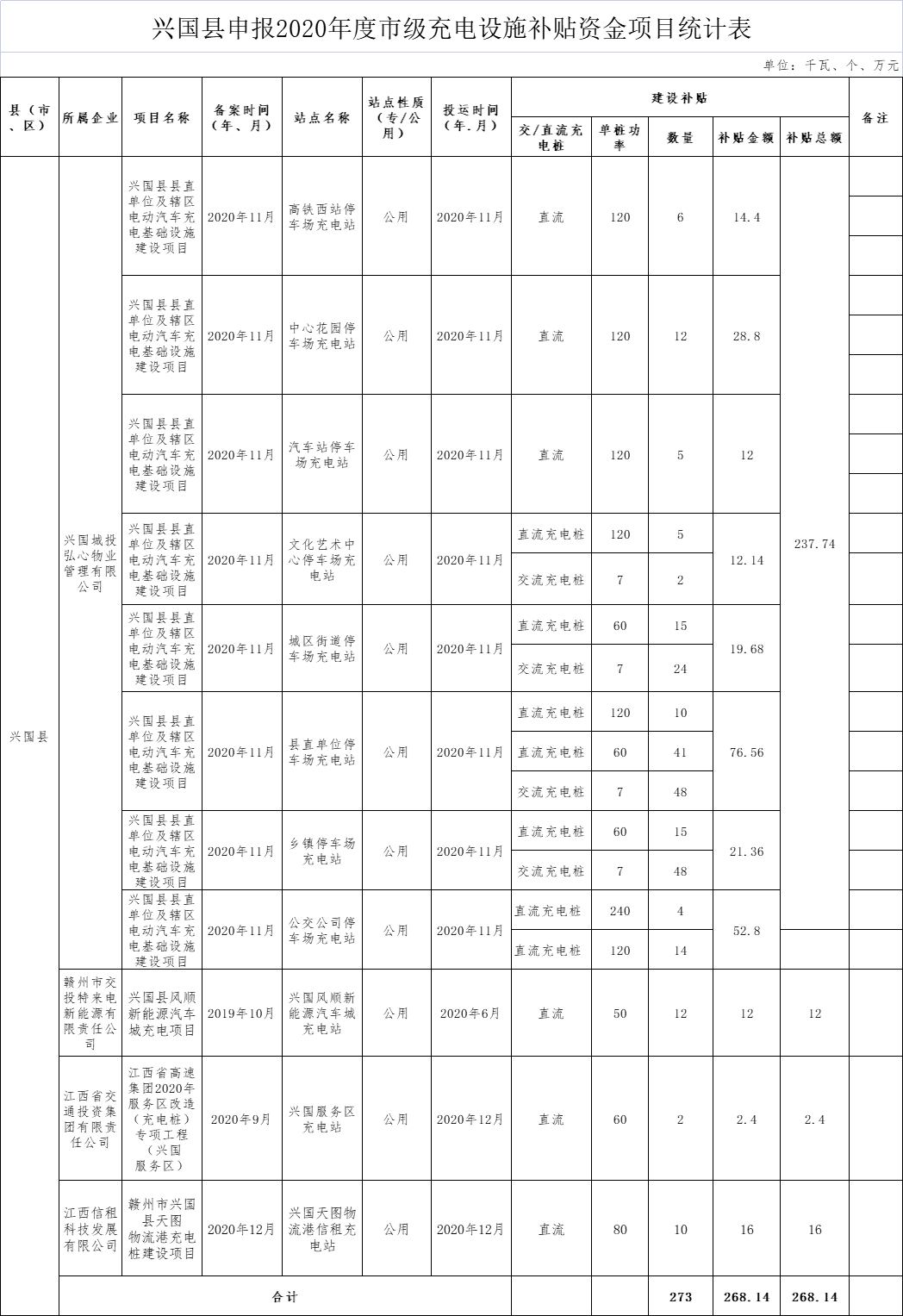 補貼金額268.14萬元!江西興國關于2020年度電動汽車充電基礎設施市級補貼資金公示3月10日(ri),興國(guo)縣發改委發布關于2020年(nian)度興國(guo)縣電動汽車充電基礎(chu)設施市級(ji)補(bu)貼(tie)資(zi)金的公(gong)示(shi)。公(gong)式中(zhong)提(ti)出(chu)興國(guo)城投(tou)弘心物業管理(li)有(you)限公(gong)司、贛州市交投(tou)特來電新能(neng)源(yuan)有(you)限責任公(gong)司、江西(xi)省(sheng)交通(tong)投(tou)資(zi)集(ji)團有(you)限責任公(gong)司及江西(xi)信租科技發展有(you)限公(gong)司4家(jia)企業申(shen)請補(bu)貼(tie)申(shen)請市級(ji)補(bu)貼(tie)金額268.14萬元。 原(yuan)文如下: 關于2020年(nian)度興國縣電(dian)動汽車充電(dian)基礎設施市級(ji)補貼資金的公示 按照《贛(gan)州市(shi)電動(dong)汽(qi)車充電基礎(chu)設施市(shi)級補(bu)(bu)貼資(zi)金(jin)(jin)(jin)管理及發放暫行辦法》(贛(gan)市(shi)財(cai)建(jian)字〔2017〕179號)和《關于(yu)做好2020年度(du)贛(gan)州市(shi)電動(dong)汽(qi)車智能(neng)充電設施市(shi)級補(bu)(bu)貼資(zi)金(jin)(jin)(jin)申請工(gong)作的通知》(贛(gan)市(shi)發改能(neng)源(yuan)字〔2021〕353號)有(you)關規定,為體現(xian)公(gong)開、公(gong)正、公(gong)平原則,現(xian)將(jiang)2020年度(du)興國縣(xian)電動(dong)汽(qi)車充電基礎(chu)設施市(shi)級補(bu)(bu)貼資(zi)金(jin)(jin)(jin)予(yu)以(yi)公(gong)示,經審核,共有(you)興國城投弘心物(wu)業管理有(you)限(xian)公(gong)司、贛(gan)州市(shi)交(jiao)投特來電新能(neng)源(yuan)有(you)限(xian)責任公(gong)司、江西省交(jiao)通投資(zi)集團有(you)限(xian)責任公(gong)司及江西信(xin)租科(ke)技(ji)發展有(you)限(xian)公(gong)司4家企業申請補(bu)(bu)貼申請市(shi)級補(bu)(bu)貼金(jin)(jin)(jin)額(e)268.14萬元(yuan)。 公示期為2022年3月11日至2022年3月15日。 如有(you)異議(yi),請于公示期內(nei)提(ti)交(jiao)書(shu)面(mian)材料,署明真實姓名和聯系方式(shi),單位提(ti)交(jiao)材料加蓋所在(zai)單位公章,逾期不予受理。 聯系方式:0797-5322073郵箱xgfgw@163.com 附件:興國縣(xian)申報2020年度市級充電(dian)設施補貼(tie)資金項(xiang)目統計(ji)表 興國縣(xian)申(shen)報2020年度市級充電設施補貼資金項目統計表 興國縣(xian)發(fa)展(zhan)和改革委(wei)員會 2022年3月(yue)10日(ri)