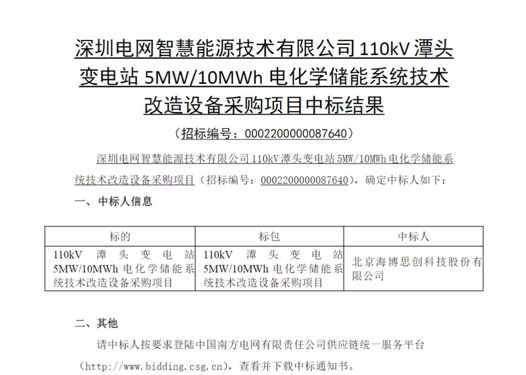 深圳電網智慧能源5MW/10MWh電化學儲能系統技術改造設備采購項目中標結果4月2日深(shen)圳電網發布110kV潭頭變電站(zhan)5MW/10MWh電化學儲能系統技(ji)術改(gai)造(zao)設(she)備采購項目中(zhong)標結(jie)果。公(gong)告披(pi)露北京海(hai)播思創科技(ji)股(gu)份有限公(gong)司中(zhong)標。根據此前公(gong)告北京海(hai)博思創科技(ji)投標價(jia)格(ge)為1880萬(wan)元。 據悉,招標(biao)公告(gao)要求(qiu)投(tou)標(biao)人必須具(ju)有(you)2018年至今的同類型電化學儲能項目供應業績。
