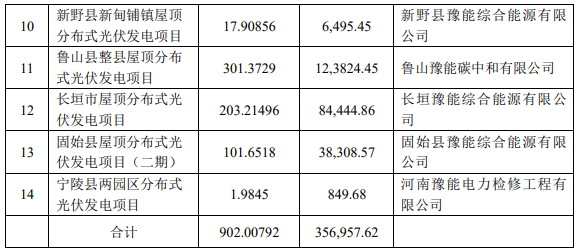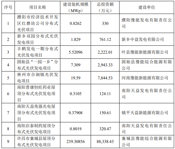4月9日,豫能控(kong)股發布公告稱,公司召(zhao)開董事(shi)會(hui)(hui)會(hui)(hui)議(yi)審議(yi)通過了《關于對外投資建(jian)設整縣屋(wu)頂分布式光(guang)伏項目及設立公司的議案》,尚需提交(jiao)股東大會審(shen)議。 公(gong)(gong)司(si)(si)(si)(si)子(zi)公(gong)(gong)司(si)(si)(si)(si)鶴(he)壁豐鶴(he)發(fa)電(dian)(dian)有(you)(you)(you)限(xian)(xian)(xian)責任公(gong)(gong)司(si)(si)(si)(si)(以下簡(jian)稱(cheng)“豐鶴(he)發(fa)電(dian)(dian)”)、南(nan)陽天(tian)益發(fa)電(dian)(dian)有(you)(you)(you)限(xian)(xian)(xian)公(gong)(gong)司(si)(si)(si)(si)(以下簡(jian)稱(cheng)“天(tian)益發(fa)電(dian)(dian)”)、新(xin)(xin)(xin)鄉中(zhong)益發(fa)電(dian)(dian)有(you)(you)(you)限(xian)(xian)(xian)公(gong)(gong)司(si)(si)(si)(si)(以下簡(jian)稱(cheng)“中(zhong)益發(fa)電(dian)(dian)”)、河(he)南(nan)豫(yu)能(neng)(neng)新(xin)(xin)(xin)能(neng)(neng)源(yuan)(yuan)有(you)(you)(you)限(xian)(xian)(xian)公(gong)(gong)司(si)(si)(si)(si)(以下簡(jian)稱(cheng)“豫(yu)能(neng)(neng)新(xin)(xin)(xin)能(neng)(neng)源(yuan)(yuan)”)擬設立(li)4個整(zheng)縣屋頂分(fen)(fen)布式(shi)光伏項目公(gong)(gong)司(si)(si)(si)(si),分(fen)(fen)別是(shi)在平頂山(shan)市(shi)(shi)葉縣、南(nan)陽市(shi)(shi)新(xin)(xin)(xin)野縣、新(xin)(xin)(xin)鄉市(shi)(shi)長垣(yuan)市(shi)(shi)、新(xin)(xin)(xin)鄉市(shi)(shi)原陽縣投資(zi)(zi)設立(li)葉縣豫(yu)能(neng)(neng)新(xin)(xin)(xin)能(neng)(neng)源(yuan)(yuan)有(you)(you)(you)限(xian)(xian)(xian)公(gong)(gong)司(si)(si)(si)(si)、新(xin)(xin)(xin)野縣豫(yu)能(neng)(neng)綜合能(neng)(neng)源(yuan)(yuan)有(you)(you)(you)限(xian)(xian)(xian)公(gong)(gong)司(si)(si)(si)(si)、長垣(yuan)豫(yu)能(neng)(neng)綜合能(neng)(neng)源(yuan)(yuan)有(you)(you)(you)限(xian)(xian)(xian)公(gong)(gong)司(si)(si)(si)(si)、原陽縣豫(yu)能(neng)(neng)綜合能(neng)(neng)源(yuan)(yuan)有(you)(you)(you)限(xian)(xian)(xian)公(gong)(gong)司(si)(si)(si)(si),認繳出資(zi)(zi)金額共計(ji)19,250萬(wan)元;公(gong)(gong)司(si)(si)(si)(si)子(zi)公(gong)(gong)司(si)(si)(si)(si)擬對外投資(zi)(zi)建(jian)設14 個屋頂分(fen)(fen)布式(shi)光伏項目,總建(jian)設裝(zhuang)機規模(mo) 902.00792MWp,總投資(zi)(zi)額 356,957.62 萬(wan)元。以上合計(ji)總投資(zi)(zi) 376,207.62 萬(wan)元。 子公(gong)司(si)對外投資設立整縣(xian)屋(wu)頂分布式(shi)光伏項目公(gong)司(si)詳情如下: 子公司對外投資(zi)建(jian)設屋頂分布式光(guang)伏(fu)項(xiang)目詳情如下(xia): 備注:上(shang)述新(xin)設立公司名稱以(yi)市場監督管理部門最(zui)終核準登記為準。