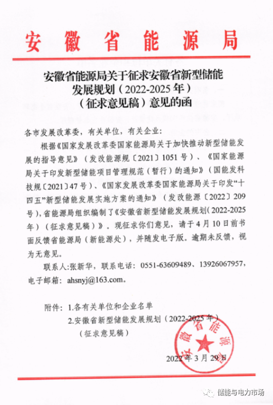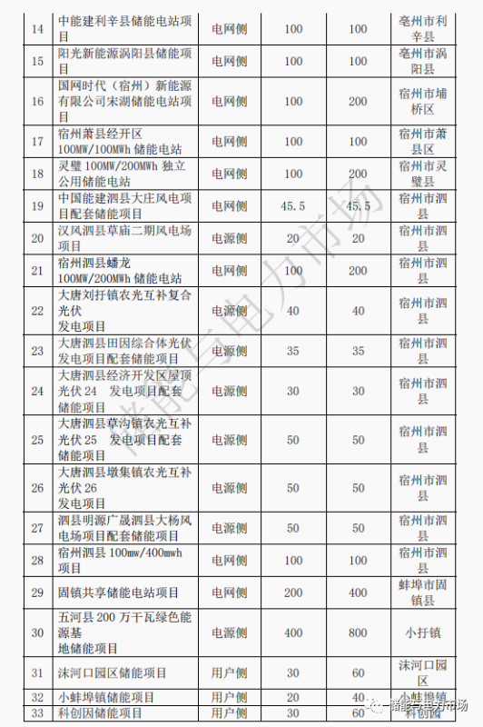 安徽省:到2025年將實現新型儲能裝機規模300萬千瓦以上。近日,安(an)徽省能源局發(fa)布(bu)《安(an)徽省新型(xing)儲能發(fa)展(zhan)規(gui)劃(2022-2025)》(征求意見(jian)稿)(以下簡稱《規(gui)劃》)。依(yi)據《規(gui)劃》,到2025年安(an)徽省將實現(xian)新型(xing)儲能裝機規(gui)模(mo)300萬(wan)千瓦(wa)以上。 與別的省份不同,安徽省明確制定了各年度新型儲能(neng)累計裝(zhuang)機規模發展目標: 2022年,800MW 2023年,1.5GW 2024年,2.1GW 2025年,3GW 電(dian)網側(ce)、電(dian)源(yuan)側(ce)、用(yong)戶側(ce)儲(chu)能多元(yuan)化發展(zhan),將支持上(shang)述目標(biao)的實(shi)現。 電網側強調(diao)集中式儲能(neng)電站,淮北、宿州(zhou)、蚌(bang)埠、亳州(zhou)等地區(qu),以及合肥、滁州(zhou)等負荷中心(xin)區(qu)域,是電網側獨立儲能(neng)電站重點發展區(qu)域。 電源(yuan)側積(ji)極推動“新能(neng)源(yuan)+儲能(neng)”應用,推動基地新能(neng)源(yuan)項目配(pei)套建設集中式(shi)儲能(neng)電站。 用(yong)戶側探索新型儲(chu)能(neng)的(de)多種應用(yong)場景(jing)及商業模式(shi)。 《規(gui)(gui)劃》對各區(qu)域(yu)的建(jian)(jian)設規(gui)(gui)模(mo)以(yi)及接入站點(dian)都(dou)進行了(le)規(gui)(gui)劃、建(jian)(jian)議、推薦(jian),并提供了(le)53個新型儲能(neng)項目列(lie)表,共計總規(gui)(gui)模(mo)5.1GW/9.1GWh。 在市(shi)場(chang)價格(ge)機(ji)制方面(mian),《規(gui)則》并(bing)未有明確的規(gui)定,但提出了未來的改(gai)革方向。例如:針對新型儲能(neng)設計充放電價格(ge)方案,優化深(shen)度調(diao)峰(feng)、緊急短時調(diao)峰(feng)等(deng)輔助服(fu)務定價機(ji)制,探(tan)索需求響應、虛擬(ni)電廠收益模式,拉大峰(feng)谷價差提升用戶側儲能(neng)電站收益等(deng)。 附項目列表。