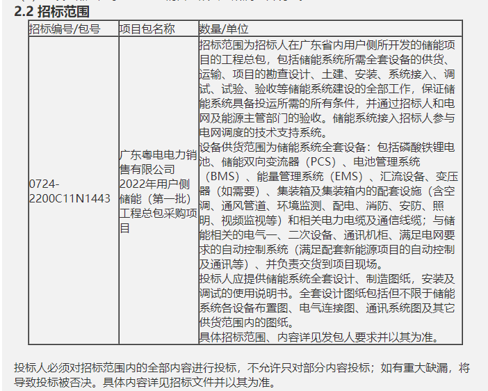 20MW/40MWh!廣東粵電2022年用戶側儲能工程總包招標4月20日廣東粵電發布2022年用戶側儲能(第一批)工程總包采購項目招標公告。據公告稱,本次招標項目規模為20MW/40MWh,其中單個項目規模在5MW/10MWh以下的項目預計總建設規模為6MW/12MWh;其中單個項目規模在5MW/10MWh以上的項目預計總建設規模為14MW/28MWh。 招標范圍包括:磷酸鐵鋰電池、儲能雙向變流器、電池管理系統等設備供貨、運輸;項目勘察、設計等等。公告要求,儲能系統EMS、PCS、EMS、電池設備中,投標人應具備至少一項為自產設備或控股子公司生產設備并提供證明文件,自產設備必須提供第三方的試驗報告,由控股子公司生產的,除提供第三方的試驗報告外,還需提供對子公司控股的相關文件證明。 廣東粵電電力銷售有限公司2022年用戶側儲能(第一批)工程總包采購項目 招標公告 1. 招標條件 本招標項目廣東粵電電力銷售有限公司2022年用戶側儲能(第一批)工程總包采購項目已批準建設,項目業主為廣東粵電電力銷售有限公司,建設資金來自發包人自有資金和銀行貸款,招標人為廣東粵電電力銷售有限公司。項目已具備招標條件,現對該項目進行公開招標。 2. 項目概況與招標范圍 2.1 項目概況 (1)招標項目名稱:廣東粵電電力銷售有限公司2022年用戶側儲能(第一批)工程總包采購項目 (2)招標編號:0724-2200C11N1443 (3)項目內容及規模:廣東粵電電力銷售有限公司2022年用戶側儲能(第一批):為招標人2022年度在廣東省內用戶側開發的儲能項目(項目規模和數量以招標人實際開發為準,該批項目總建設規模預估為20MW/40MWh,采用單價招標方式),主要用于峰谷套利和參與廣東省需求響應市場化交易。本次集中招標采購主要考慮了通用條件和技術條件,在招標完后根據具體項目實際情況確定特殊要求和技術指標參數。 本次集中招標儲能預估總容量為20MW/40MWh,單個項目容量為5MW/10MWh以下的項目預估總建設規模為6MW/12MWh,單個項目容量為5MW/10MWh及以上的項目預估總建設規模為14MW/28MWh。 (4)建設地點:廣東粵電電力銷售有限公司所屬項目現場。 2.3 計劃工期 雙方簽訂具體項目的合同協議書起60個自然日內。具體內容詳見《廣東粵電電力銷售有限公司2022年用戶側儲能(第一批)工程總包采購項目技術規范書》。 投標人資格要求 3.1 基本要求 3.1.1資質要求 (1)資格能力要求:儲能系統EMS、PCS、BMS、電池設備中,投標人應具備至少1項為自產設備或控股子公司生產設備并提供證明文件,自產設備必須提供第三方認證的試驗報告,由控股子公司生產的,除提供第三方認證的試驗報告外,還需提供對子公司控股的相關證明文件。 (2)投標人所應用的電池單體必須通過 CNAS質檢機構產品檢測,并提供檢測報告。 3.1.2 財務要求 (1)投標人未處于財產被接管、凍結、破產狀態。(以投標人提供加蓋公章的《資格聲明》為準)。 3.1.3 信譽要求 (1)投標人(若聯合體投標,指聯合體各成員)沒有處于財產被接管、凍結、破產的狀態; (2)投標人(若聯合體投標,指聯合體各成員)沒有處于被責令停業。 (3)投標人(若聯合體投標,指聯合體各成員)沒有處于被建設行政主管部門暫停或取消投標資格的處罰期內。 (4)投標人(若聯合體投標,指聯合體各成員)未被列入“信用中國”網站(.cn)的“失信懲戒對象”、“失信被執行人”、“重大稅收違法案件當事人名單”。 (5)投標人(若聯合體投標,指聯合體各成員)未被列入“國家企業信用信息公示系統”(.cn)的“嚴重違法失信企業名單(黑名單)”。 (以投標人提供加蓋公章的《資格聲明》為準) 3.1.4人員資質要求 無。 3.1.5其他要求 (1)投標人為中華人民共和國境內合法注冊的獨立法人或其他組織,具有獨立承擔民事責任能力,具有獨立訂立合同的權利,并在人員、設備、資金等方面具有保障如期交貨等承擔招標項目的能力。(以投標人提供加蓋公章的有效的營業執照(副本)復印件和《資格聲明》為準)。 (2)投標人須提供第三方檢測機構出具的電芯產品檢測報告或產品認證。 (3)本次招標不接受聯合體投標。 3.2 業績要求 投標人應同時具備滿足以下①和②要求的業績: ①自2019年1月1日(以合同簽訂時間為準)起至投標截止日止,投標人必須具備至少兩項容量10MW或20MWh以上(含容量10MW或20MWh)的儲能系統業績。 ②自2019年1月1日(以合同簽訂時間為準)起至投標截止日止,投標人必須具備累計100MWh以上(含100MWh)的儲能系統供貨業績。 注:業績證明資料需提供合同協議書關鍵頁(含封面、項目內容、簽字或蓋章頁)復印件;合同協議書未顯示工程規模的,需要提供業主證明復印件。