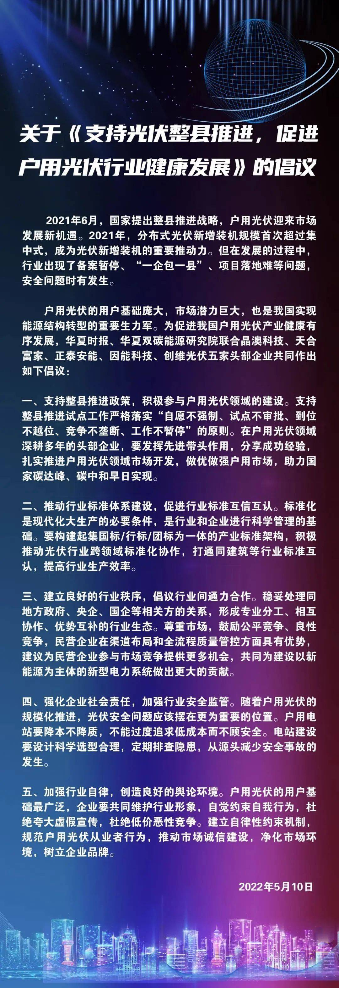 5月10日下午,以“屋頂上的革命 戶用光伏大爆發”為主題的2022年中國戶用光伏發展峰會如期召開。峰會由《華夏時報》、華夏雙碳能源研究院主辦,正泰安能總裁助理朱建波受邀參加,并與天合富家、創維光伏等多家知名企業相聚云端,共商戶用光伏創新之道,為行業發展積極建言。 盡管面對原材料漲價、疫情等不穩定因素,但據國家能源局統計,2022年第一季度戶用光伏新增裝機2.55GW,同比增長102.4%,再創歷史新高。戶用光伏已成為我國如期實現“碳達峰、碳中和”目標及落實“鄉村振興”戰略的重要力量。 ![]() 在政策的鼓舞下,戶用光伏即將迎來新一輪爆發。作為深耕戶用光伏行業多年的先行者,自2015年以來,正泰安能累計安裝超50萬座戶用光伏電站,裝機規模超8GW,積極探索綠色能源發展“新路徑”。 “去年6月,國家能源局發布整縣推進政策,戶用光伏行業迎來了爆發式增長!“圓桌對話環節時,朱建波如是說。他就戶用光伏市場發展前景及頭部企業如何落實政策發表看法,并認為政策的發布有效推動了行業朝著規模化、規范化的方向發展。他還建議各方在政策執行過程中充分發揮優勢、攜手共進,遵循國家政策促進行業健康發展。 在快速發展的同時,業內又該如何進行自我提升?朱建波認為,在主管部門的支持下,以正泰安能為例,公司始終踐行頭部企業責任,從模式創新到規范管理,從產品品質到電站運營,通過智能化、網格化、專業化的電站全生命周期運維體系,堅持以客戶為中心、以市場為導向,助推“雙碳”進程。 會上,正泰安能、天合富家、因能科技、創維光伏、晶澳科技與《華夏時報》、華夏雙碳能源研究院聯合發布關于 《支持光伏整縣推進,促進戶用光伏行業健康發展》的倡議書。 未來,正泰安能將進一步加強規劃引領,健全市場機制,做好保障措施, 通過正泰全場景、全業務、全服務、全公益的“全模式”為百姓增收創收,助力實現“共同富裕”目標。