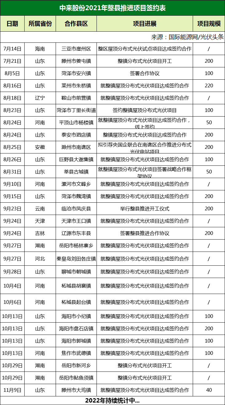 2021年,光伏應用系統業務實現營收22.07億元,同比大漲88.62%。戶用分布式業務覆蓋達14省400個縣左右,并與上海源燁約定 2022-2025 年均新增裝機容量不低于1.5GW。截至2022年5月7日,中來股份已簽約整縣、鎮分布式光伏項目共107個,簽約規模約10.3GW。 中來股份2021年在光伏應用系統領域交出了一份漂亮的成績單,這不僅緣于2021年分布式光伏大爆發,更在于多年來,中來股份始終堅持技術為先、用戶至上的戰略布局,在“雙碳”目標及鄉村振興戰略的引領下,借助領先的產品、精專的渠道、成熟的分布式電站管理、領先的設計和集成能力以及強大的電站開發管理能力,以標準化流程覆蓋電站全生命周期,在實踐過程中不斷修正和改進,為整縣推進提供了快速落地的基礎,幫助百萬家庭分享到“陽光紅利”。 1聚焦Topcon技術 中來股份在整縣推進中擁有技術優勢 在光伏行業摸爬滾打多年,林建偉對于光伏電池情有獨鐘。在他看來整個產業鏈里其他材料都是按公斤來計量成本,唯獨電池是按瓦數來算,行業核心是電池。“誰要把電池做好了,對整個產業的貢獻最大,把電池的效率做高了,整體成本都會下降。”林建偉這句話道出了中來股份的發展之道,把握好技術方向、技術高度、規模節奏,在技術和商業模式上形成閉環以及升級能力,依托“光伏背板、高效電池和組件、光伏應用系統”三駕馬車,公司發展日漸穩健,努力構建面向未來的產業生態鏈,實現綠色能源以及2060“碳中和”。 早在八年前,當大家對于新一輪的電池技術還沒有感覺的時候,中來股份已經做出了一個具有戰略眼光的決定,投身TOPCon技術。因此,中來股份成為了第一個吃TOPCon技術量產螃蟹的企業。但這個螃蟹可不是那么好吃的,它意味著未知的企業發展風險,更要命的是巨額的資金投入。 林建偉對此感觸頗深:“N型電池第一個吉瓦的投資在7~10個億,比現在的HIT還要貴,那時候有點畸形的偏高。”但是中來挺過來了,價格從1吉瓦7個億降到2個億以內,基本上跟PERC的投資接近。 根據中國光伏行業協會的報告,2021 年PERC平均轉換效率是23.1%,N型 TOPCon 電池平均轉換效率達到24%。中來TOPCon平均量產效率也達到了24%以上,在基于182mm大尺寸硅片的基礎上,取得了實驗室電池效率25.4%的好成績。 國家整縣推進屋頂分布式光伏是個大市場,充滿了機遇和挑戰。最大的挑戰就是對光伏設備提出了新的技術要求。用戶最關心的莫過于在有限的屋頂面積內,能夠多發電。這意味著要有更高效的光伏電池。 下圖是一組真實的分布式光伏數據表(該數據引用自中來官方微信公眾號): 數據證明,采用中來N型雙面組件用戶,在裝機量低于PERC組件的前提下,發電量反而更高。除此之外,中來的N型雙面組件還能適應各種復雜的氣候環境。 正因為有這樣的技術優勢,中來股份在激烈的整縣推進大市場的競爭中,占據了一席之地。 2深耕分布式光伏 中來股份在整縣推進中擁有經驗優勢 早在2016年中來民生就開始探索分布式光伏市場。中來民生作為中來股份旗下的子公司,承擔著開拓分布式光伏市場的重任。經過六年艱苦摸索,中來民生已經發展成為一家集分布式光伏電站開發、設計、建設及運維于一體的光伏企業。 在整縣推進風口到來之前,中來民生以鄉村振興為抓手,積極致力于打造“碳中和新鄉村”。在鄉村新能源開發模式上,中來民生響應國家政策,符合市場需求,聯合央國企共同進行模式創新,打造適配于戶用分布式業務的合作模式。農戶提供屋頂,公司負責開發、設計、建設和運營維護,這個一攬子解決方案,為用戶解決了資金、技術以及后期運維難題,實現了用戶、央國企、開發商“多贏”的局面。 中來股份與中國美術學院教育基金會共同設立“中來基金”,支持中國美術學院學科發展和美麗中國未來鄉村建設,雙方將為建設中國美麗鄉村貢獻出藝術力量和綠色方案。 可以說早在國家整縣推進政策出臺之前,中來民生已經積極開拓分布式光伏市場且成效顯著。中來民生戶用分布式業務覆蓋已達14省400個縣左右。這組龐大的數據背后,是中來民生多年努力的成果,也是他們參與整縣推進豐富經驗的見證。 3依托大型央國企 中來股份在整縣推進中擁有戰略優勢 2021年2月24日,中來與中電投電力工程有限公司(現更名為“上海能源科技發展有限公司”)于上海簽訂合資協議,正式成立合資公司,專注于分布式光伏電站的開發建設,致力于構建光伏市場高水平、高層次的產業生態。 4月30日,中來民生全資子公司中來智聯與上海源燁簽署了《戶用光伏發電項目EPC總承包協議》。 5月20日,中來和內蒙國電投戰略合作,開發光伏新能源。 7月15日,中來下轄子公司與國家電投山西分公司達成合作協議,雙方就清潔能源項目以及高效電池組件供應展開合作。 11月24日,國家電投董事長、黨組書記錢智民會見中來股份董事長林建偉一行,雙方就縣域綜合智慧能源業務進行交流并達成共識。 12月6日,中來股份與五凌電力簽訂戰略合作協議,雙方將立足湖南省,輻射周邊,爭取在整縣推進等項目上有所突破,盡早為湖南乃至更多區域經濟低碳高質量發展貢獻力量。 12月8日,中來股份與國家電投河南公司簽訂戰略合作協議,雙方就新能源市場影響力打開新局面,落地更多試點項目。 2022年3月15日,中來與山西省太原市、古交市政府簽署《戰略合作與投資協議》,擬于古交
