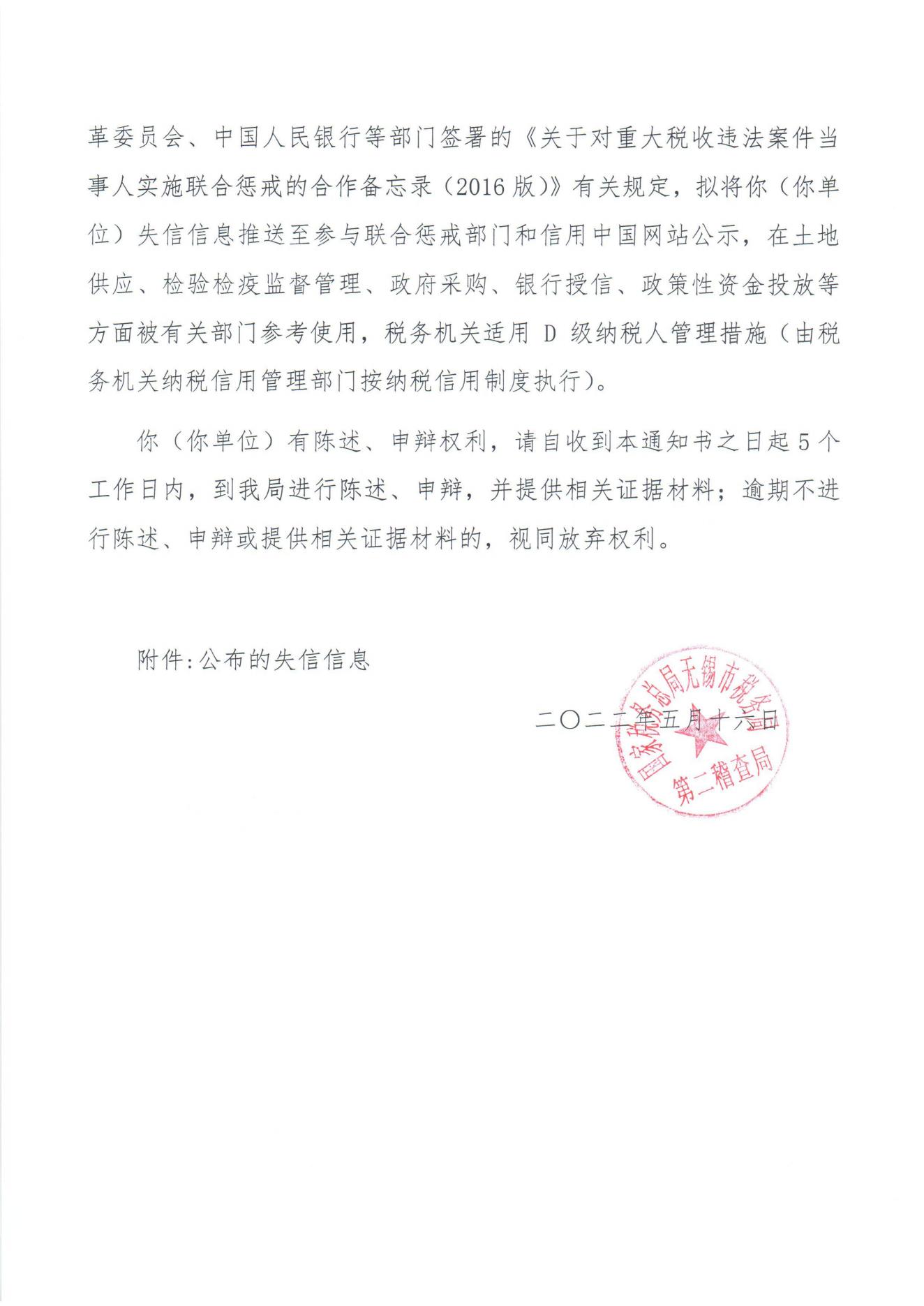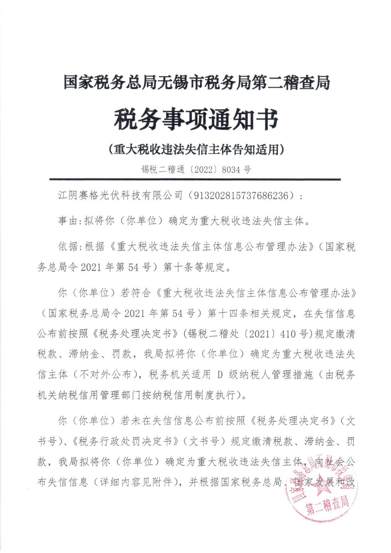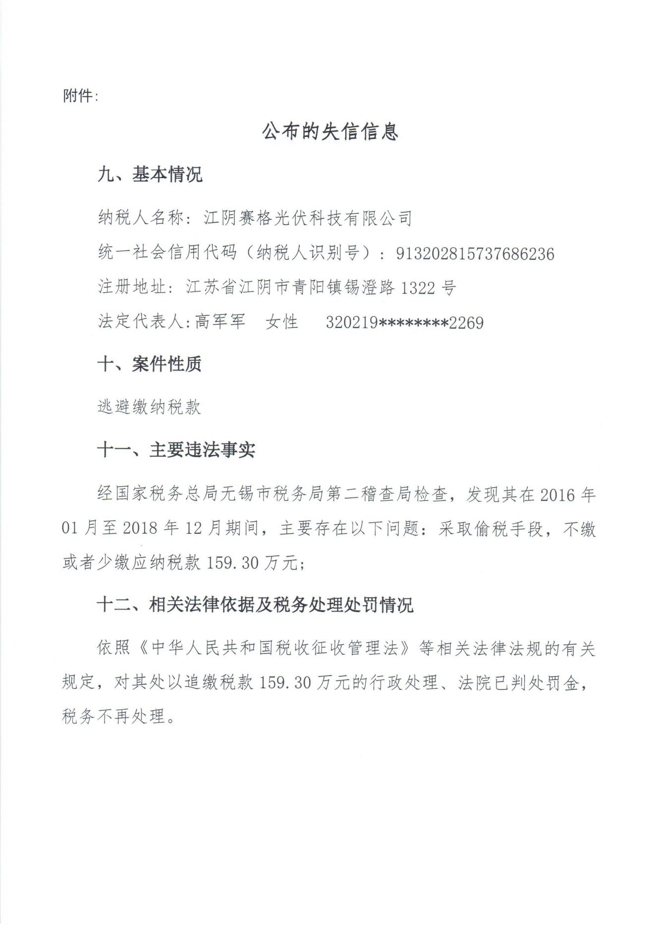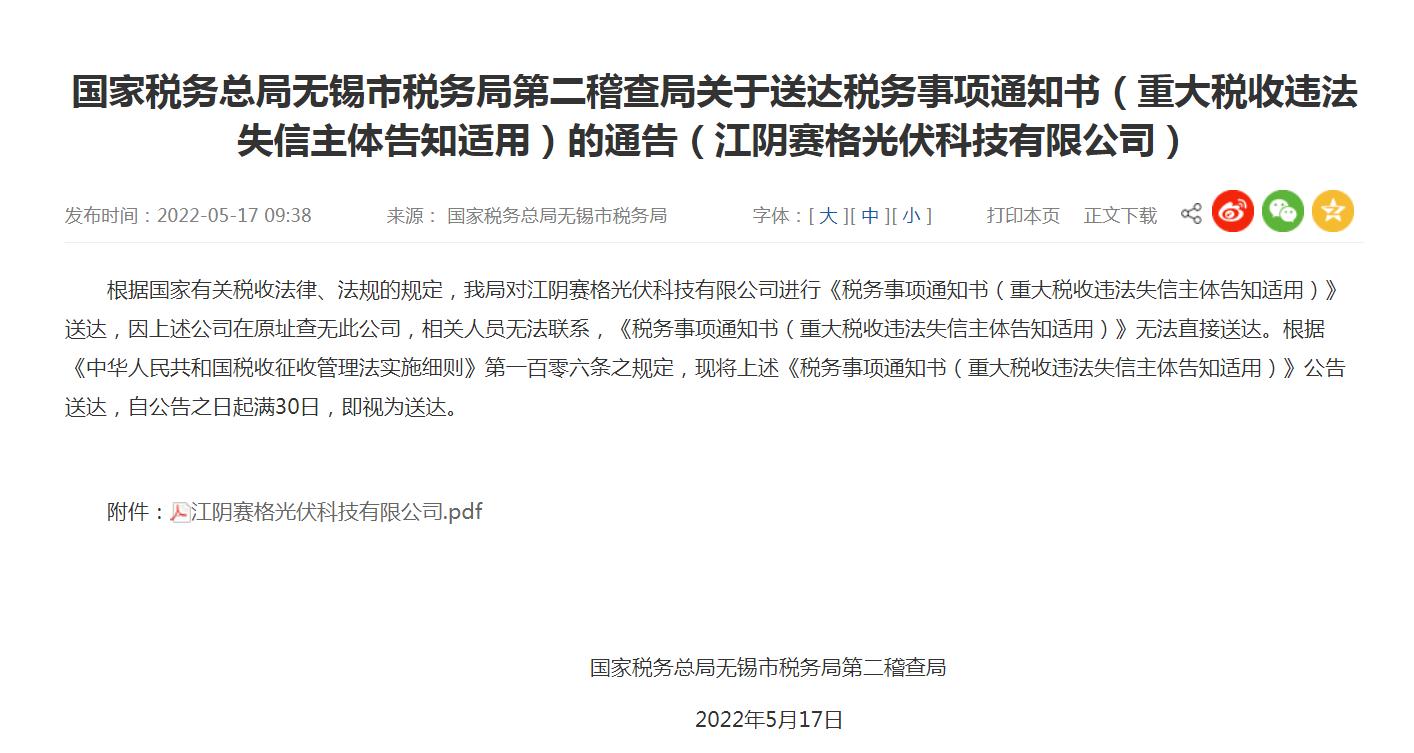 5月(yue)17日,國(guo)家稅(shui)(shui)(shui)務(wu)總局(ju)江蘇(su)省稅(shui)(shui)(shui)務(wu)局(ju)發(fa)布“國(guo)家稅(shui)(shui)(shui)務(wu)總局(ju)無錫市稅(shui)(shui)(shui)務(wu)局(ju)第二稽(ji)查局(ju)關于送(song)達稅(shui)(shui)(shui)務(wu)事項通知書(重大稅(shui)(shui)(shui)收違法(fa)失信主體告(gao)知適用)的通告(gao)(江陰賽格光(guang)伏科技有限公司)”。 相關附件顯示,經國家稅務(wu)總局(ju)無錫市稅務(wu)局(ju)第二(er)稽(ji)查(cha)局(ju)檢查(cha),發(fa)現江陰賽格光伏科技有(you)限(xian)公司(si)在2016年01月(yue)至2018年12月(yue)期間,主要(yao)存在以下問題:采取偷稅手段,不繳或(huo)者少繳應納稅款159.30萬元。 相(xiang)關信(xin)息(xi)顯示,江陰(yin)賽(sai)格光伏(fu)科技(ji)有限公司成立于2011年4月(yue)26日(ri),經(jing)營(ying)范(fan)圍(wei)為單晶硅(gui)(gui)圓(yuan)棒的研究、開發(fa)、銷售;光伏(fu)組(zu)件及配(pei)件的系統安(an)裝、銷售;太陽能硅(gui)(gui)片(pian)、電池片(pian)、硅(gui)(gui)材料(不含危險品)、金屬材料、機械設(she)備(bei)、五金產品的銷售。