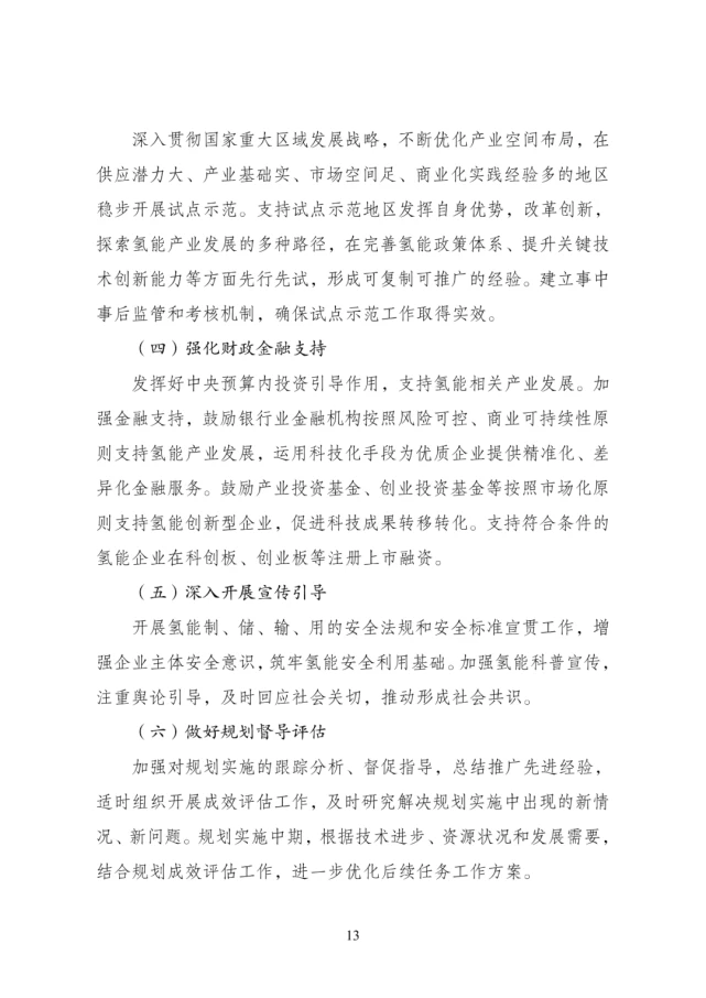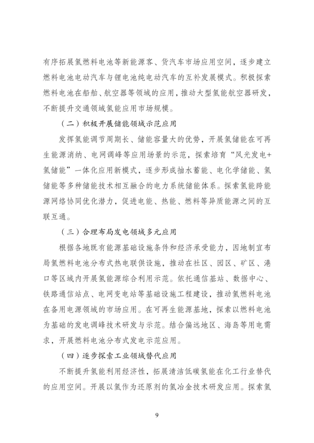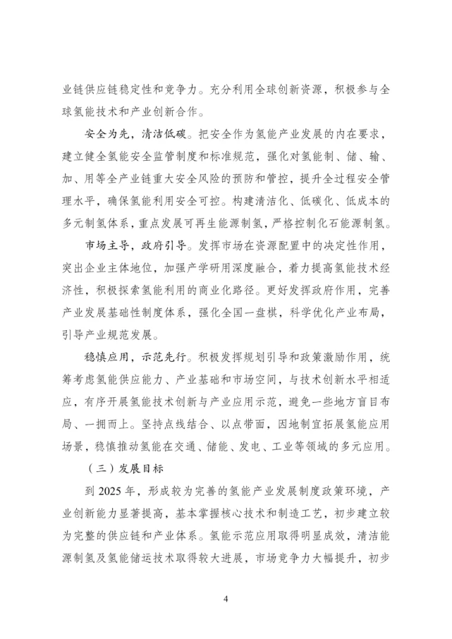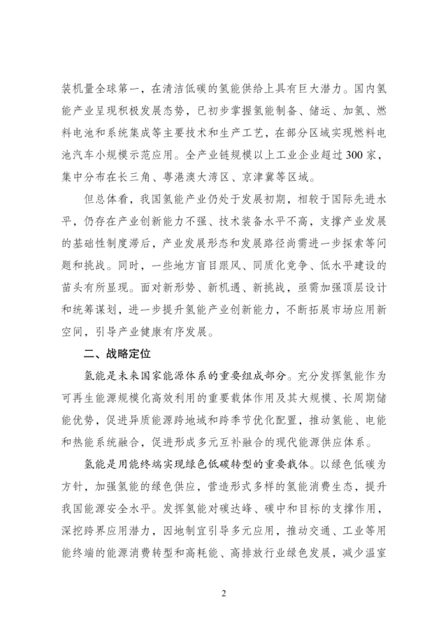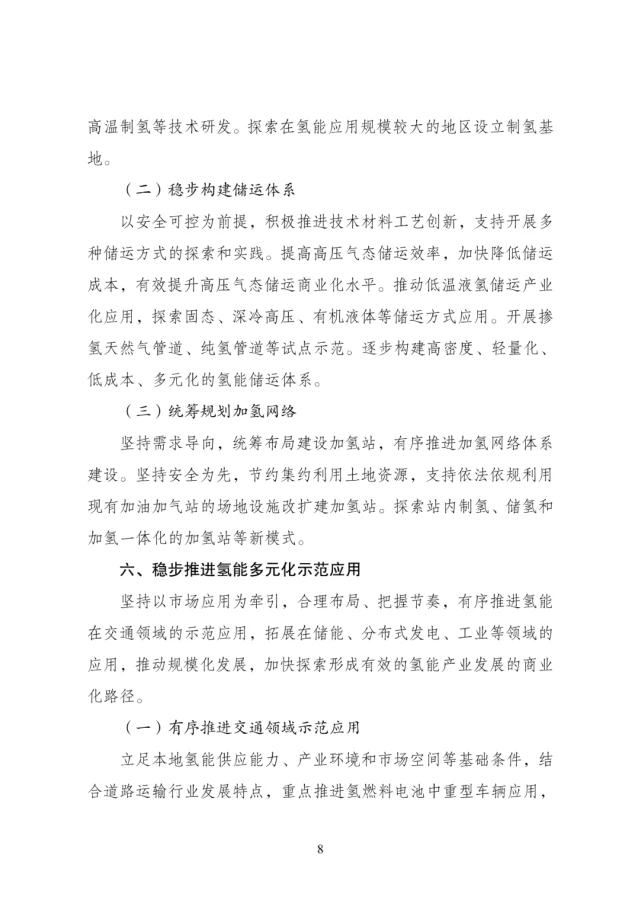 國家氫能中長期規劃(2021-2035年)發布國國家發(fa)展和(he)改革委員會(hui)網站(zhan)公布(bu)“氫能(neng)產業發(fa)展中長期規劃(2021-2035 年)”。 規劃指出,氫(qing)能(neng)(neng)(neng)(neng)是未來國家能(neng)(neng)(neng)(neng)源(yuan)體(ti)系的重要組(zu)成(cheng)部分(fen)。充分(fen)發(fa)揮氫(qing)能(neng)(neng)(neng)(neng)作為 可再(zai)生能(neng)(neng)(neng)(neng)源(yuan)規模化(hua)高效利用(yong)的重要載體(ti)作用(yong)及其大規模、長周期儲 能(neng)(neng)(neng)(neng)優(you)勢,促進(jin)異質能(neng)(neng)(neng)(neng)源(yuan)跨地(di)域(yu)和(he)跨季節優(you)化(hua)配置,推動氫(qing)能(neng)(neng)(neng)(neng)、電(dian)能(neng)(neng)(neng)(neng) 和(he)熱能(neng)(neng)(neng)(neng)系統融合(he),促進(jin)形成(cheng)多(duo)元互補融合(he)的現代(dai)能(neng)(neng)(neng)(neng)源(yuan)供(gong)應體(ti)系。 氫(qing)能(neng)是用(yong)(yong)能(neng)終端實現(xian)綠(lv)(lv)(lv)色低(di)碳(tan)(tan)(tan)轉(zhuan)型的(de)(de)重要載體(ti)。以綠(lv)(lv)(lv)色低(di)碳(tan)(tan)(tan)為(wei) 方(fang)針,加強(qiang)氫(qing)能(neng)的(de)(de)綠(lv)(lv)(lv)色供應,營(ying)造形式多樣(yang)的(de)(de)氫(qing)能(neng)消(xiao)費生態,提升 我國能(neng)源安全(quan)水平。發(fa)揮氫(qing)能(neng)對(dui)碳(tan)(tan)(tan)達峰、碳(tan)(tan)(tan)中和目標的(de)(de)支撐作用(yong)(yong), 深挖跨界(jie)應用(yong)(yong)潛力(li),因地制宜(yi)引導多元應用(yong)(yong),推動交通、工(gong)業(ye)等用(yong)(yong) 能(neng)終端的(de)(de)能(neng)源消(xiao)費轉(zhuan)型和高耗(hao)能(neng)、高排放行業(ye)綠(lv)(lv)(lv)色發(fa)展(zhan),減(jian)少(shao)溫室氣體(ti)排放。 氫能(neng)產業(ye)(ye)(ye)(ye)是(shi)戰略性新(xin)(xin)(xin)興產業(ye)(ye)(ye)(ye)和未來產業(ye)(ye)(ye)(ye)重點發展方向。以科技(ji) 自立自強(qiang)為引領,緊扣全(quan)球新(xin)(xin)(xin)一輪科技(ji)革(ge)命(ming)和產業(ye)(ye)(ye)(ye)變革(ge)發展趨勢, 加(jia)強(qiang)氫能(neng)產業(ye)(ye)(ye)(ye)創新(xin)(xin)(xin)體系(xi)建設,加(jia)快突(tu)破(po)氫能(neng)核心技(ji)術和關鍵材料瓶(ping) 頸,加(jia)速(su)產業(ye)(ye)(ye)(ye)升級(ji)壯大,實(shi)現(xian)產業(ye)(ye)(ye)(ye)鏈(lian)良性循(xun)環和創新(xin)(xin)(xin)發展。踐(jian)行創 新(xin)(xin)(xin)驅動(dong),促進氫能(neng)技(ji)術裝備取得突(tu)破(po),加(jia)快培(pei)育(yu)新(xin)(xin)(xin)產品、新(xin)(xin)(xin)業(ye)(ye)(ye)(ye)態、 新(xin)(xin)(xin)模式(shi),構建綠色低(di)碳產業(ye)(ye)(ye)(ye)體系(xi),打造產業(ye)(ye)(ye)(ye)轉型升級(ji)的新(xin)(xin)(xin)增長點, 為經(jing)濟高質量發展注入(ru)新(xin)(xin)(xin)動(dong)能(neng)。 規劃提出,到 2025 年,形成(cheng)較為完善的(de)氫(qing)能(neng)產(chan)業發展制度(du)政策環境(jing),產(chan) 業創(chuang)新能(neng)力顯著提高(gao),基本掌握核心技(ji)術(shu)和(he)制造工藝,初步建(jian)立較 為完整的(de)供(gong)應(ying)(ying)鏈和(he)產(chan)業體系。氫(qing)能(neng)示(shi)范應(ying)(ying)用取得明顯成(cheng)效(xiao),清潔能(neng) 源制氫(qing)及氫(qing)能(neng)儲運技(ji)術(shu)取得較大(da)進展,市場競爭力大(da)幅提升,初步 5 建(jian)立以工業副產(chan)氫(qing)和(he)可再生(sheng)能(neng)源制氫(qing)就近利用為主的(de)氫(qing)能(neng)供(gong)應(ying)(ying)體 系。燃料(liao)電(dian)池(chi)車(che)輛保有量約 5 萬(wan)輛,部署(shu)建(jian)設(she)一批加氫(qing)站(zhan)。 可再生能(neng)(neng)(neng)源(yuan)(yuan)制(zhi)氫(qing)(qing)量達(da)到10-20萬噸/年,成(cheng)為新增(zeng)氫(qing)(qing)能(neng)(neng)(neng)消費的(de)重要組(zu)成(cheng)部分, 實(shi)(shi)現二(er)氧化碳(tan)(tan)減排 100-200 萬噸/年。再經(jing)過 5 年的(de)發展(zhan),到 2030 年,形成(cheng)較為完備的(de)氫(qing)(qing)能(neng)(neng)(neng)產(chan)業(ye)(ye)技 術(shu)創新體(ti)系(xi)、清潔能(neng)(neng)(neng)源(yuan)(yuan)制(zhi)氫(qing)(qing)及供(gong)應(ying)體(ti)系(xi),產(chan)業(ye)(ye)布(bu)局合理有序,可再 生能(neng)(neng)(neng)源(yuan)(yuan)制(zhi)氫(qing)(qing)廣泛應(ying)用,有力支(zhi)撐(cheng)碳(tan)(tan)達(da)峰(feng)目(mu)標實(shi)(shi)現。到 2035 年,形成(cheng)氫(qing)(qing)能(neng)(neng)(neng)產(chan)業(ye)(ye)體(ti)系(xi),構建涵蓋交通、儲能(neng)(neng)(neng)、工(gong)業(ye)(ye) 等領域的(de)多(duo)元氫(qing)(qing)能(neng)(neng)(neng)應(ying)用生態(tai)。可再生能(neng)(neng)(neng)源(yuan)(yuan)制(zhi)氫(qing)(qing)在終端能(neng)(neng)(neng)源(yuan)(yuan)消費中的(de) 比(bi)重明顯提升(sheng),對能(neng)(neng)(neng)源(yuan)(yuan)綠(lv)色轉型發展(zhan)起到重要支(zhi)撐(cheng)作用。 圍繞氫能高(gao)質量發展(zhan)重(zhong)大需求(qiu),準確把握氫能產業創(chuang)(chuang)新(xin)(xin)發展(zhan)方 向(xiang),聚焦(jiao)短板(ban)弱項,適度超前部署一批氫能項目,持續加強基礎研 究、關鍵技術和顛(dian)覆(fu)性技術創(chuang)(chuang)新(xin)(xin),建立完(wan)善更加協同高(gao)效的創(chuang)(chuang)新(xin)(xin)體 系,不斷提(ti)升氫能產業競爭力和創(chuang)(chuang)新(xin)(xin)力。 加(jia)快推(tui)進質子交換膜(mo)燃(ran)料(liao)電池(chi)技術創(chuang)新(xin),開(kai)發(fa)(fa)關(guan)(guan)(guan)鍵(jian)(jian)材料(liao),提(ti)高(gao)(gao) 主要(yao)性能(neng)(neng)指標和(he)批量(liang)化生(sheng)產能(neng)(neng)力,持(chi)續提(ti)升(sheng)燃(ran)料(liao)電池(chi)可(ke)靠(kao)性、穩(wen)定 性、耐久性。支持(chi)新(xin)型燃(ran)料(liao)電池(chi)等技術發(fa)(fa)展(zhan)。著力推(tui)進核(he)心(xin)零部件 以及(ji)