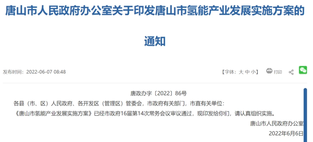 河北省唐山市人民政府發布《唐山市氫能產業發展實施方案》6月7日,唐山(shan)市人(ren)民政府發(fa)布《唐山(shan)市氫能(neng)產(chan)業發(fa)展實施(shi)方案》。 其中(zhong)氫能方面指出:到(dao)2025年,建(jian)成(cheng)加(jia)氫站30座(zuo)(加(jia)注能力(li)(li)約30t/d),氫燃料電池(chi)汽(qi)車(che)運營數量力(li)(li)爭(zheng)達(da)到(dao)2500輛,構(gou)筑起涵蓋(gai)燃料電(dian)池汽車及車用氫能制、儲、運(yun)、加全產業鏈協同(tong)的自主研發(fa)產業體系,引(yin)進國內(nei)先(xian)進企業8-10家,氫能產業營(ying)業收入達(da)到200億元(yuan)。積極利用(yong)太陽能、風能等可再生能源,開發(fa)和發展規模化綠(lv)色制(zhi)氫,支持在非(fei)化工園區開展風(feng)電(dian)制(zhi)氫、光伏制(zhi)氫項目,依托大(da)唐國(guo)際、國(guo)能集團(tuan)、華潤(run)電力、省建(jian)投等重點企業在(zai)開(kai)平區(qu)、豐潤(run)區(qu)、海港開(kai)發區(qu)開展(zhan)可再生能源制氫(qing)。全市新增10萬千瓦以(yi)上光伏項目配套建設制氫(qing)工廠,作為區域(yu)氫(qing)源補充(chong)。 原文如下: 唐山市人民政(zheng)府(fu)辦公室關于印(yin)發唐山市氫能產 業發展實施方(fang)案的通知 唐政辦字〔2022〕86號(hao) 各(ge)縣(xian)(市(shi)、區(qu))人民(min)政府、各(ge)開發區(qu)(管理區(qu))管委(wei)會,市(shi)政府有關部門,市(shi)直有關單位(wei): 《唐山市氫能產(chan)業發展實施方案》已經(jing)市政府16屆第14次常務會議審議通過,現印發給你們,請認真組織實施。 唐山市(shi)人民政府(fu)辦公室 2022年6月6日 唐山市氫(qing)能產業發(fa)展(zhan)實施方案 發(fa)展(zhan)氫(qing)能產業(ye)是(shi)應(ying)對氣候變(bian)化、踐行綠色發(fa)展(zhan)理念(nian)、全面提(ti)高資源利(li)用效率的(de)(de)重要路徑(jing)。按照財政部、國家發(fa)展(zhan)改(gai)革(ge)委(wei)、工(gong)業(ye)和信息化部、科學技(ji)術(shu)部、國家能源局《關(guan)于啟動(dong)燃料(liao)(liao)電池汽車示范應(ying)用工(gong)作的(de)(de)通知》要求,依據《河(he)北省氫(qing)能產業(ye)發(fa)展(zhan)實施意(yi)見》《河(he)北省氫(qing)能產業(ye)發(fa)展(zhan)“十四五”規劃》《唐山市氫(qing)能產業(ye)發(fa)展(zhan)規劃(2021-2025)》等文件精神(shen),為高質量發(fa)展(zhan)氫(qing)燃料(liao)(liao)電池汽車產業(ye),加(jia)快推動(dong)“五位(wei)一體”綠色能源體系建設,促進(jin)汽車產業(ye)新(xin)舊動(dong)能轉(zhuan)換,引(yin)領氫(qing)能技(ji)術(shu)創(chuang)新(xin)和產業(ye)發(fa)展(zhan),特制定本(ben)方(fang)案。 一、指導(dao)思想 堅持以習(xi)近平(ping)新(xin)(xin)時代中國特色社(she)會主義(yi)思想為(wei)指(zhi)導,全面(mian)貫徹落(luo)實黨的(de)十(shi)九(jiu)(jiu)大、十(shi)九(jiu)(jiu)屆系列全會精神(shen)和(he)習(xi)近平(ping)總書(shu)記“三(san)個(ge)努力建成”“三(san)個(ge)走在前列”重要(yao)指(zhi)示精神(shen),牢固樹立創(chuang)(chuang)新(xin)(xin)、協調、綠(lv)色、開(kai)放、共(gong)享的(de)新(xin)(xin)發展理念(nian),立足實現(xian)“碳達峰、碳中和(he)”目(mu)標,緊(jin)緊(jin)抓住(zhu)氫燃料(liao)(liao)電池汽車(che)示范(fan)城(cheng)市推(tui)(tui)廣應用機(ji)遇,打(da)造具有唐山特色的(de)氫能(neng)(neng)產(chan)業(ye)發展新(xin)(xin)高地, 加快提升(sheng)產(chan)業(ye)技術創(chuang)(chuang)新(xin)(xin)與裝備制造水平(ping),推(tui)(tui)進氫能(neng)(neng)多(duo)領(ling)域應用和(he)基礎設施建設,打(da)造氫能(neng)(neng)全產(chan)業(ye)鏈(lian),引領(ling)氫燃料(liao)(liao)電池汽車(che)產(chan)業(ye)朝著高質量、高效率、可持續(xu)的(de)方向(xiang)發展。 二、發展(zhan)目(mu)標 (一)產(chan)(chan)業(ye)規(gui)模顯著(zhu)提升。搶(qiang)抓京津(jin)冀地區氫(qing)(qing)能(neng)(neng)產(chan)(chan)業(ye)一體(ti)化發展重要機遇,加(jia)快引進(jin)(jin)(jin)一批(pi)具(ju)有自主知識產(chan)(chan)權、掌握核心技術的(de)企(qi)業(ye)落戶唐(tang)山市。力(li)爭到2023年,引進(jin)(jin)(jin)國內先進(jin)(jin)(jin)企(qi)業(ye)3-5家,氫(qing)(qing)能(neng)(neng)產(chan)(chan)業(ye)營業(ye)收(shou)入達(da)(da)到50億(yi)元;到2025年,構筑(zhu)起(qi)涵蓋燃料電池汽車(che)及車(che)用(yong)氫(qing)(qing)能(neng)(neng)制、儲(chu)、運、加(jia)全產(chan)(chan)業(ye)鏈協同的(de)自主研發產(chan)(chan)業(ye)體(ti)系,引進(jin)(jin)(jin)國內先進(jin)(jin)(jin)企(qi)業(ye)8-10家,氫(qing)(qing)能(neng)(neng)產(chan)(chan)業(ye)營業(ye)收(shou)入達(da)(da)到200億(yi)元。 (二(er))核心(xin)技(ji)(ji)術不斷突破(po)。堅持創新驅動發(fa)展(zhan)戰略(lve),以技(ji)(ji)術創新促(cu)進氫能(neng)產(chan)業發(fa)展(zhan)。力爭到2023年,基(ji)本形成涵蓋氫能(neng)產(chan)業全(quan)鏈條(tiao)的技(ji)(ji)術研發(fa)、檢驗檢測體系。突破(po)電堆、膜(mo)電極(ji)、催化劑技(ji)(ji)術,研制制氫、加(jia)氫關(guan)鍵設備(bei),突破(po)核心(xin)技(ji)(ji)術。到2025年,基(ji)本掌握(wo)高效低成本的氫氣制取、儲(chu)運、加(jia)注和燃料電池(chi)等關(guan)鍵技(ji)(ji)術,顯(xian)著降低應(ying)用成本。 (三)應(ying)用場景(jing)(jing)持(chi)續擴(kuo)大(da)。在科技創(chuang)新(xin)和產(chan)業落(luo)地雙輪驅動(dong)的基礎上(shang)(shang)(shang),持(chi)續擴(kuo)大(da)應(ying)用場景(jing)(jing)。充分利用唐山市(shi)(shi)工業副產(chan)制氫(qing)(qing)資源豐富優勢條(tiao)(tiao)件,打造“兩(liang)區(qu)兩(liang)線(xian)”(遷(qian)安市(sh